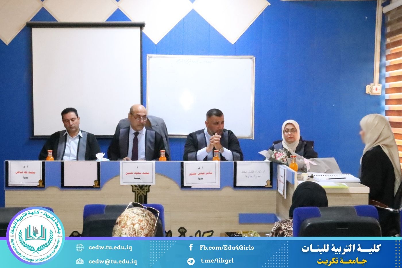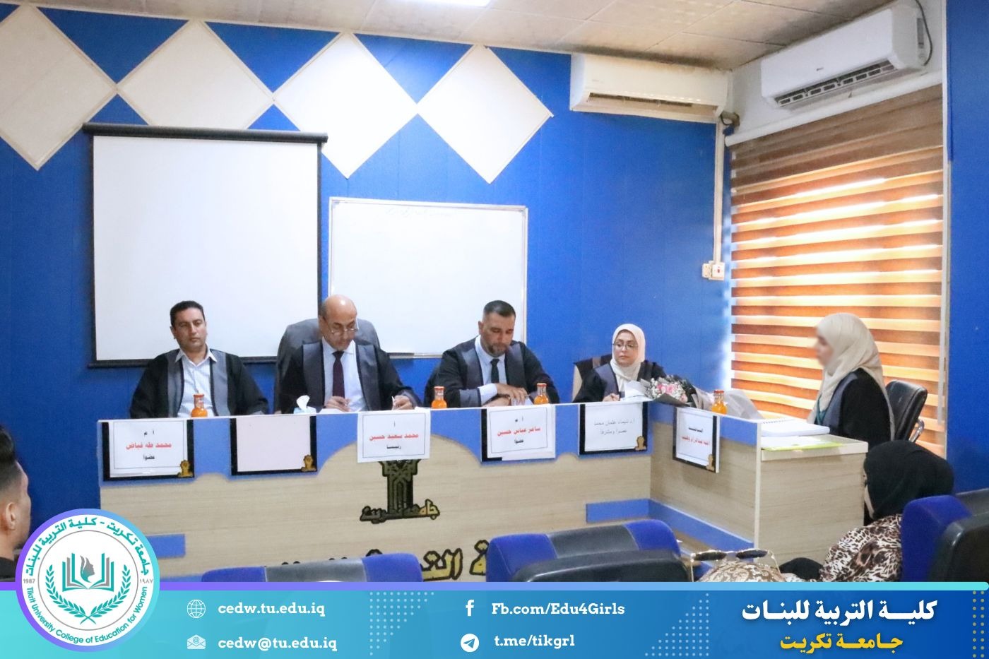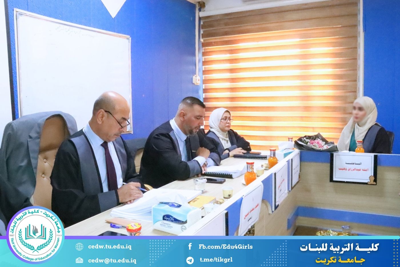 جرت في كلية التربية للبنات – جامعة تكريت/ قسم اللغة العربية، صباح يوم الاثنين الموافق ١ أيلول ٢٠٢٥، مناقشة رسالة الماجستير المقدَّمة من الطالبة (آمنة عبدالرزاق وهيب)، والموسومة: