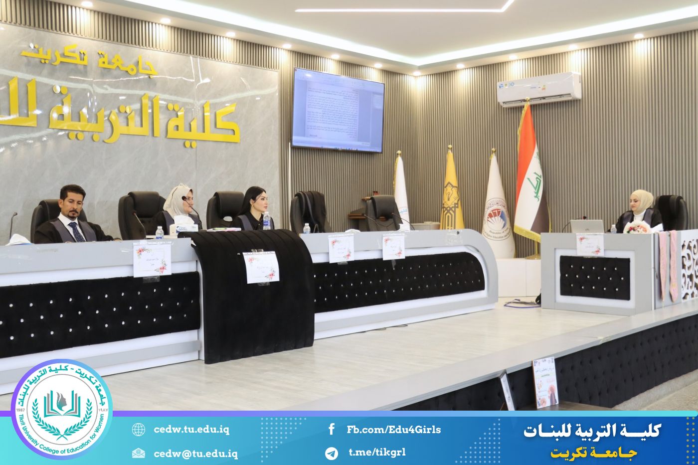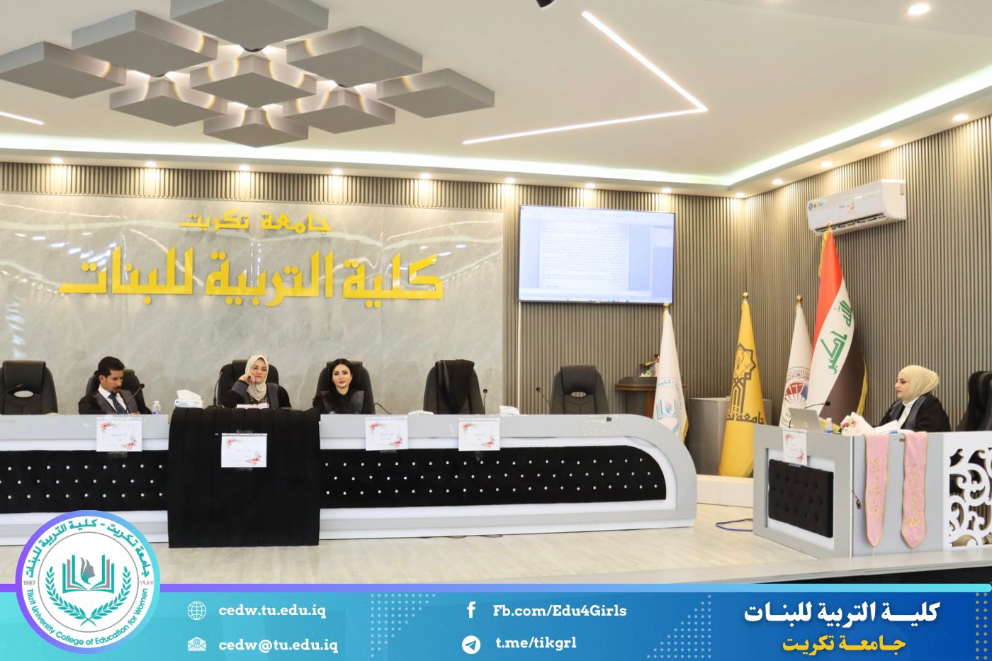 نوقشت في كلية التربية للبنات، قسم اللغة الإنكليزية، اليوم الثلاثاء الموافق 19/ 8/ 2025، على قاعة المرحوم الأستاذ الدكتور جايد زيدان في عمادة الكلية، رسالة الماجستير المقدمة من الطالبة هند سالم داود، والموسومة: