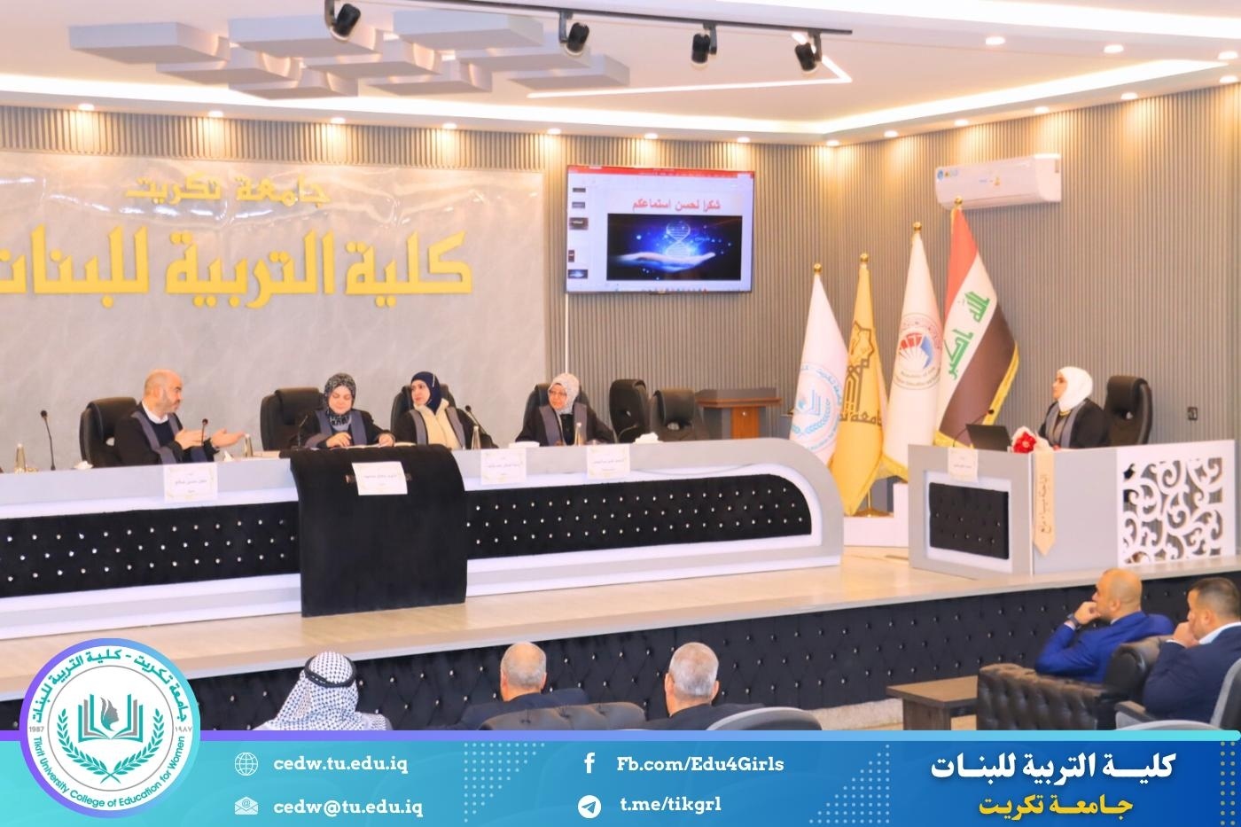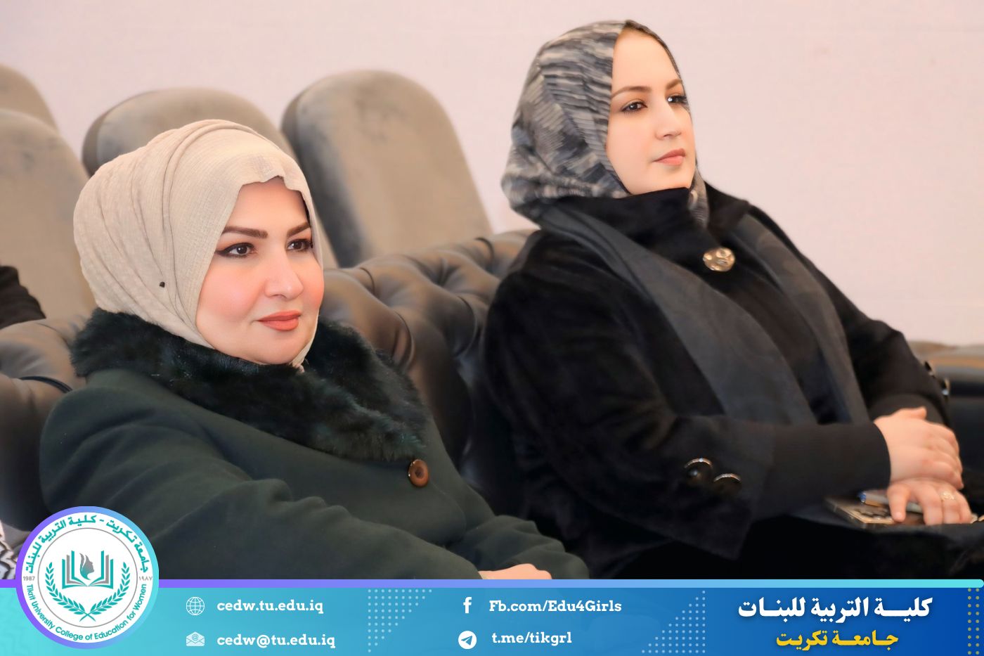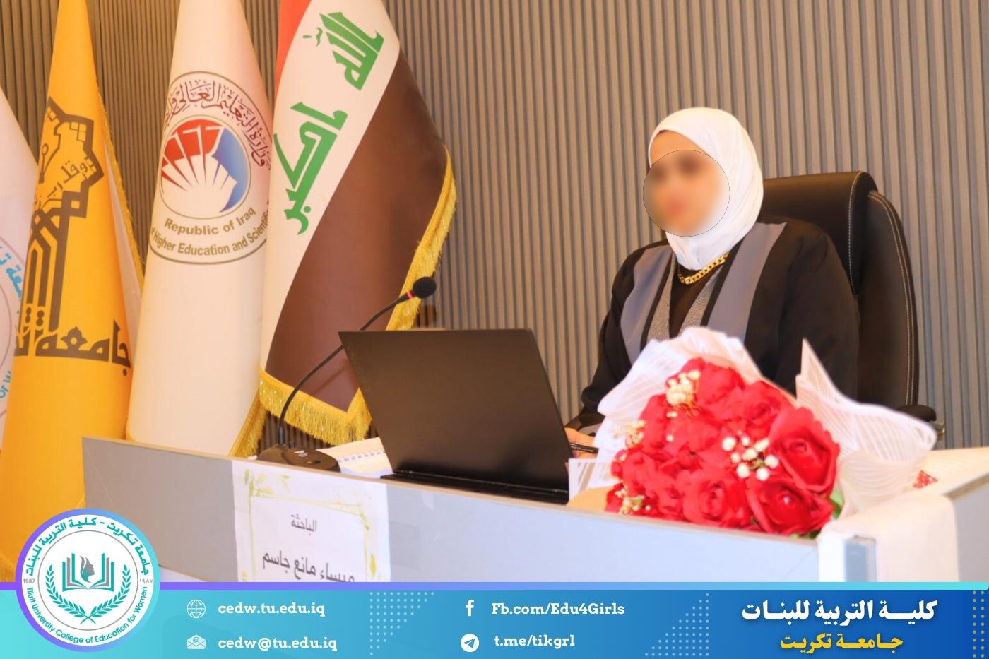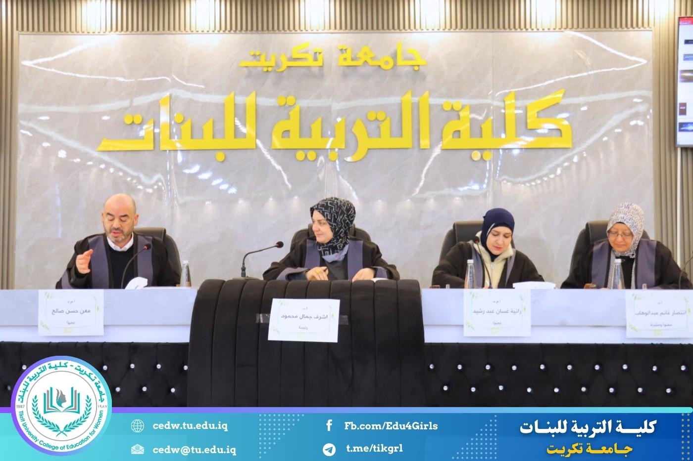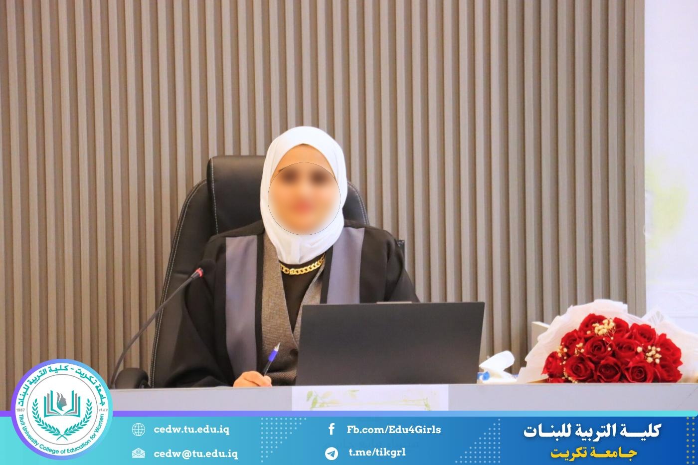 وقد حضر المناقشة السيدة عميد كلية التربية للبنات الأستاذ الدكتورة نجلاء عبدالحسين عليوي، والسيدة معاون العميد للشؤون الإدارية الأستاذ المساعد الدكتورة سلمى خالد ياسين، وعدد من السادة التدريسيين في الكلية