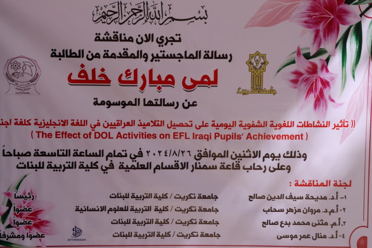 نوقشت في كلية التربية للبنات قسم اللغة الإنجليزية يوم الاثنين الموافق 2024-08-26، وعلى رحاب قاعة السمنار في الأقسام العلمية للكلية، رسالة ماجستير للطالبة لمى مبارك خلف والموسومة