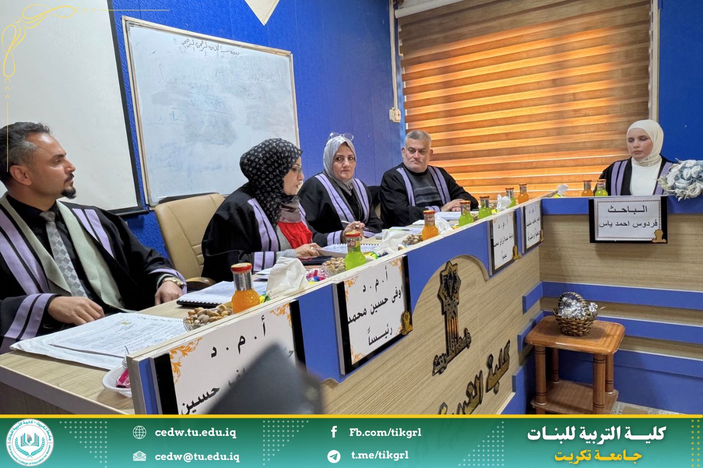 نوقشت في كلية التربية للبنات جامعة تكريت قسم اليوم الأربعاء الموافق ٢٦ / ٢ / ٢٠٢٥ ، وعلى رحاب قاعة المرحوم الأستاذ الدكتور جايد زيدان