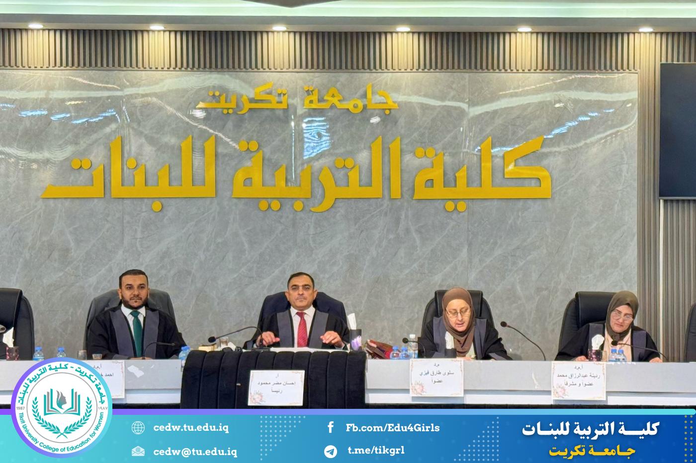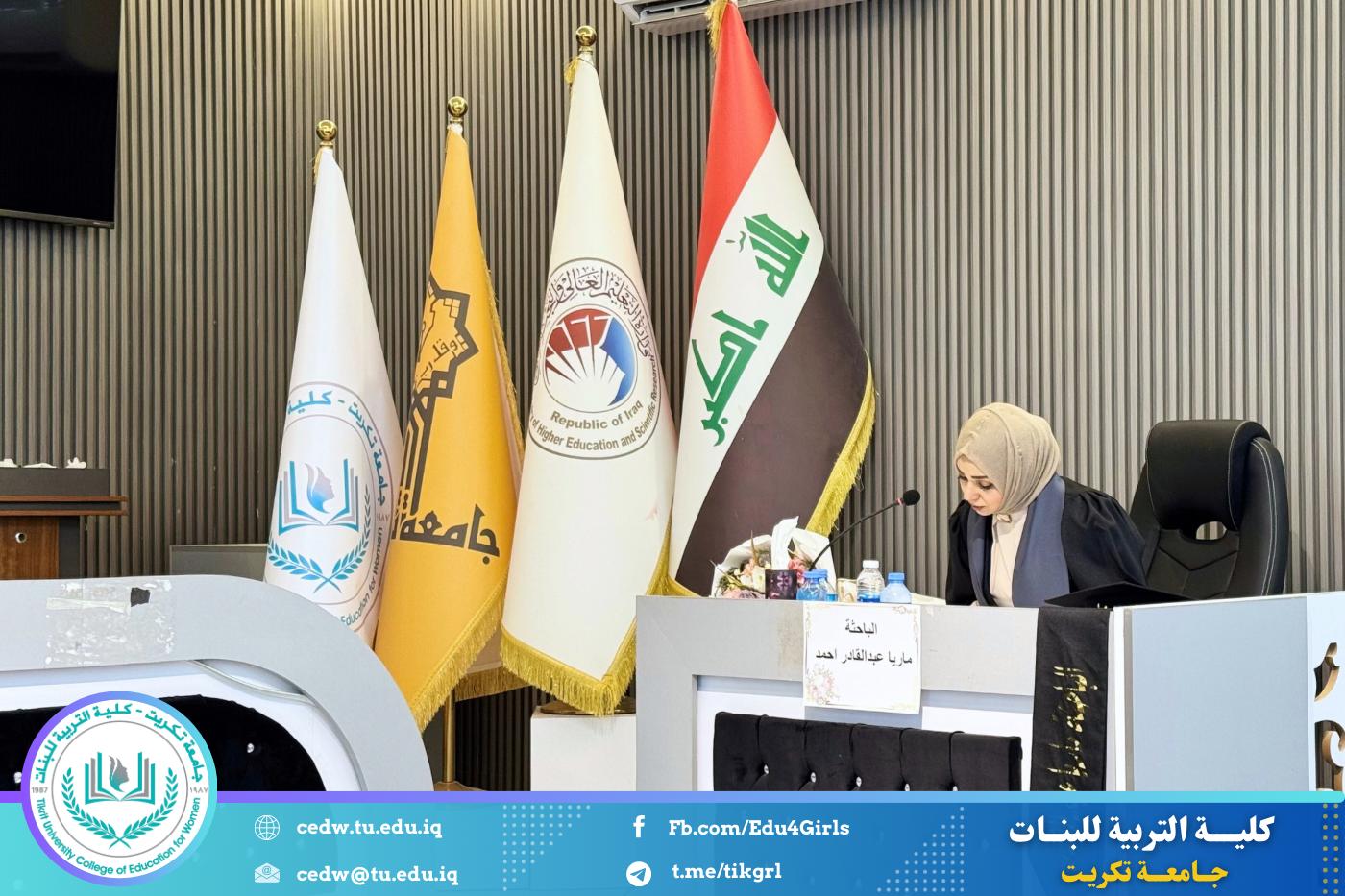 نوقشت في كلية التربية للبنات – قسم اللغة الإنكليزية، اليوم الثلاثاء الموافق 26 / 8 / 2025، على قاعة المرحوم الأستاذ الدكتور جايد زيدان في عمادة الكلية، رسالة الماجستير المقدمة من الطالبة ماريا عبدالقادر أحمد، والموسومة: