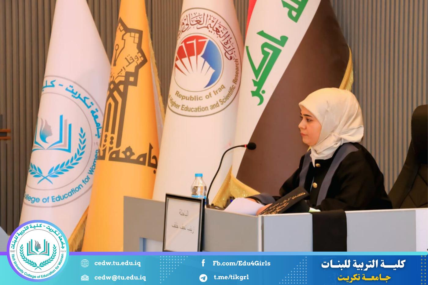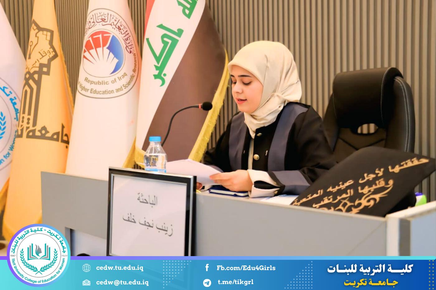 نوقشت في كلية التربية للبنات – قسم اللغة العربية، يوم الخميس الموافق (27 / 11 / 2025)، على قاعة المرحوم الأستاذ الدكتور جايد زيدان في عمادة الكلية، رسالة الماجستير المقدّمة من الطالبة زينب نجف خلف، والموسومة: