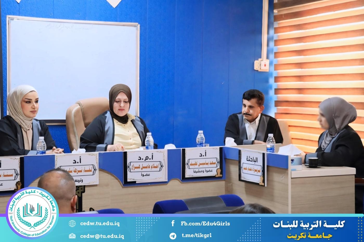 نوقشت في كلية التربية للبنات – قسم اللغة العربية، اليوم الخميس الموافق 28 / 8 / 2025، على قاعة السمنار في عمادة الكلية، رسالة الماجستير المقدمة من الطالبة عزيزة دحام حمد، والموسومة: