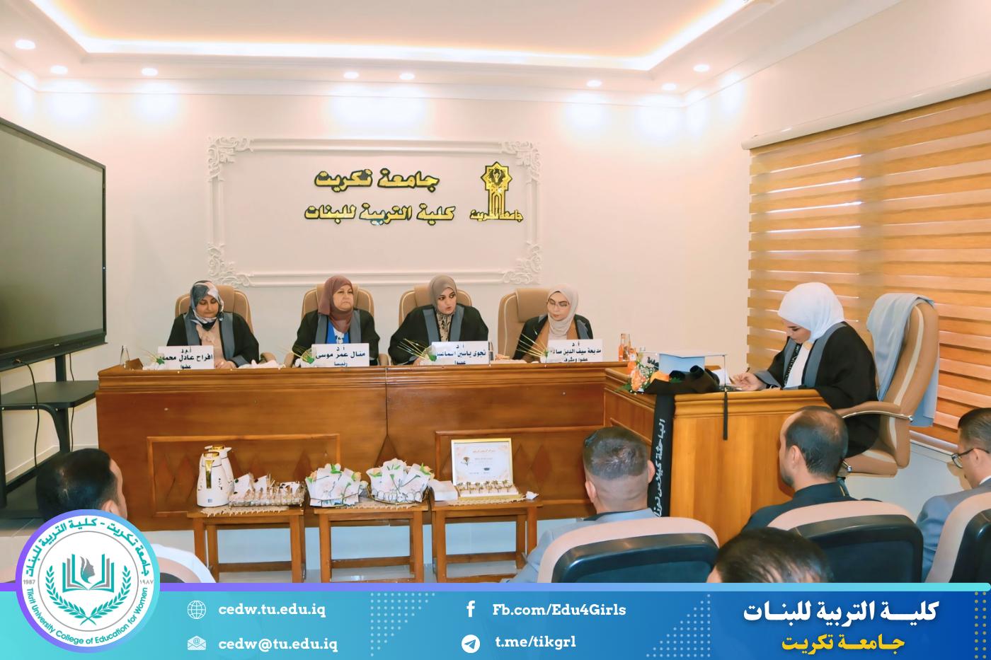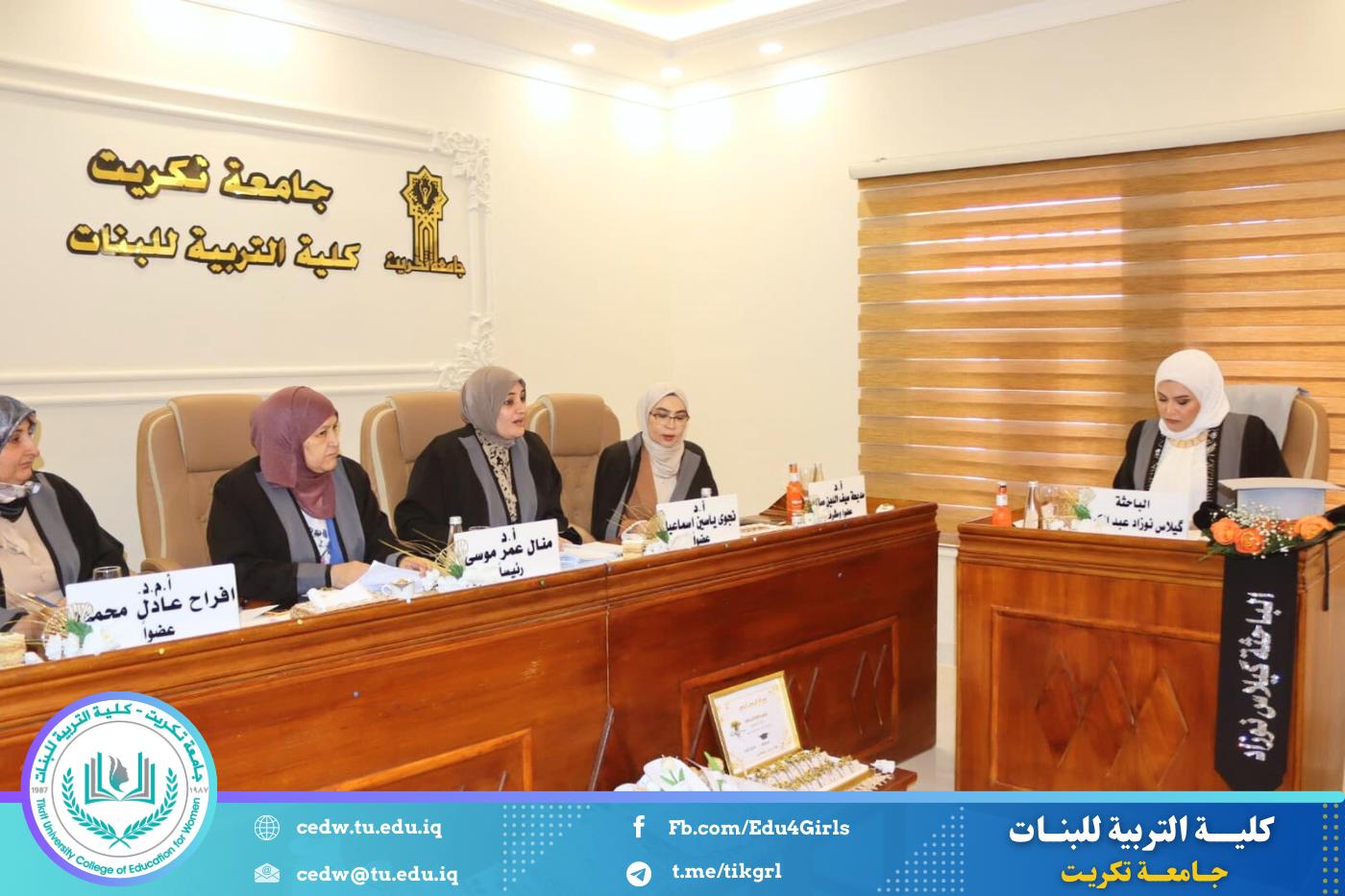 نوقشت في قسم اللغة الإنكليزية بكلية التربية للبنات – جامعة تكريت، صباح يوم الخميس الموافق ٢٨ آب ٢٠٢٥، مناقشة رسالة الماجستير المقدّمة من الطالبة (گيلاس نوزاد عبدالكريم)،