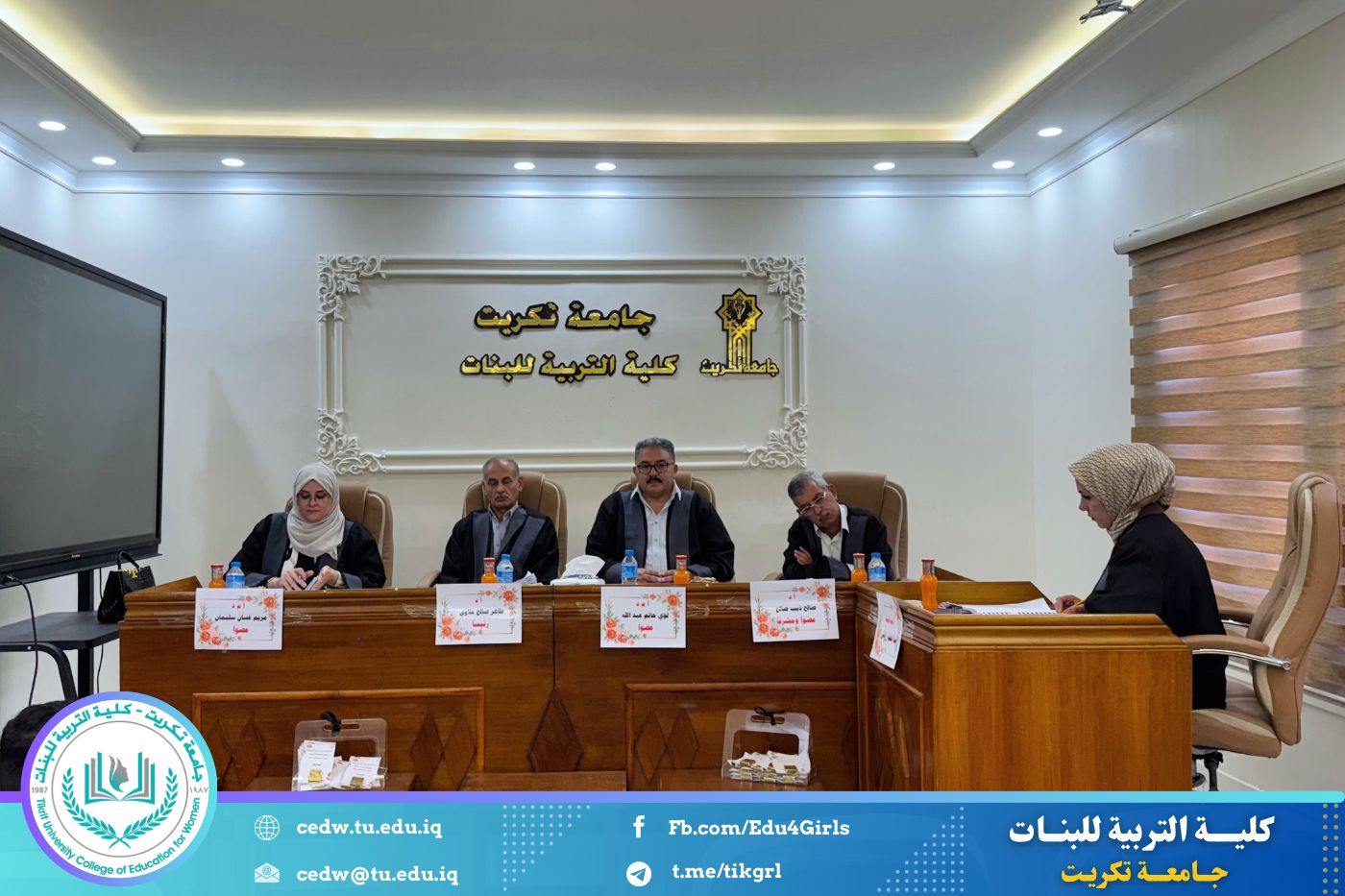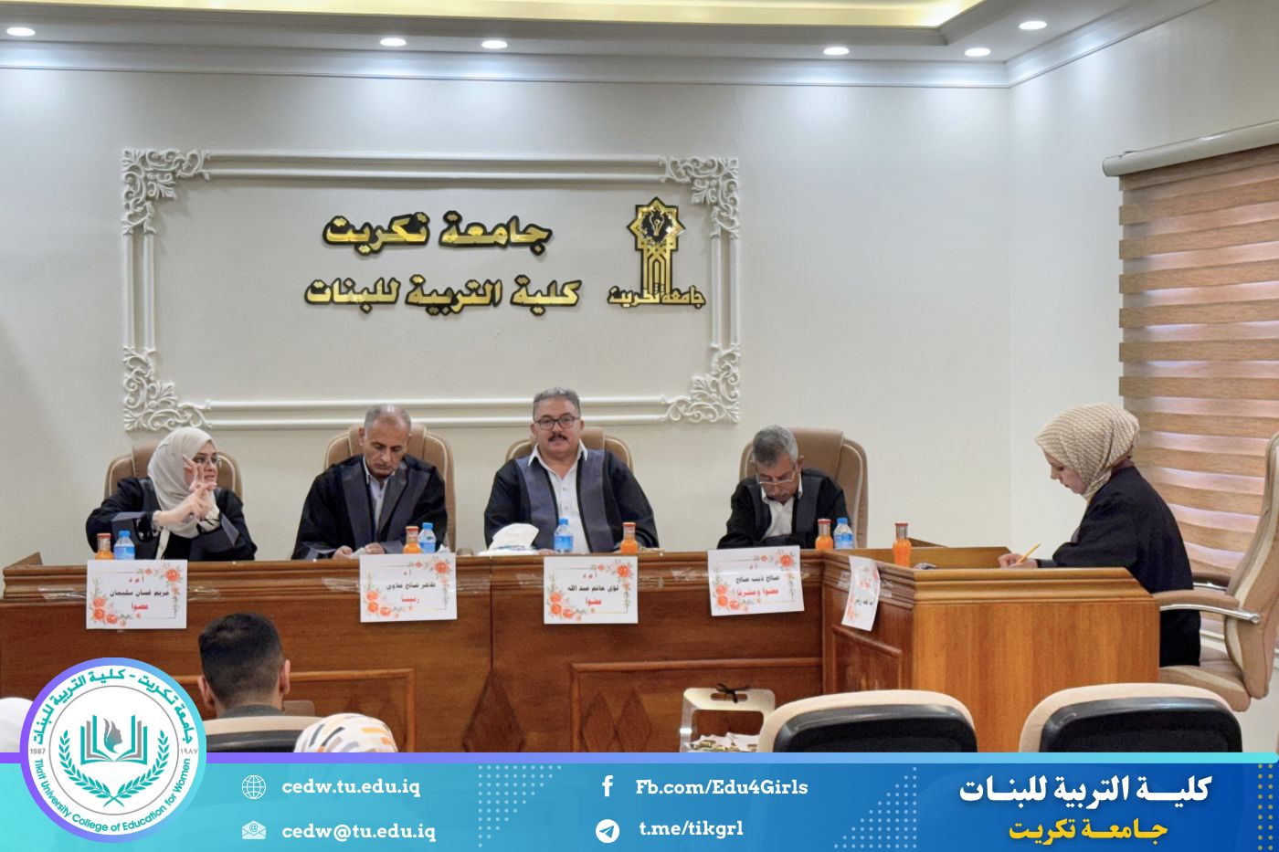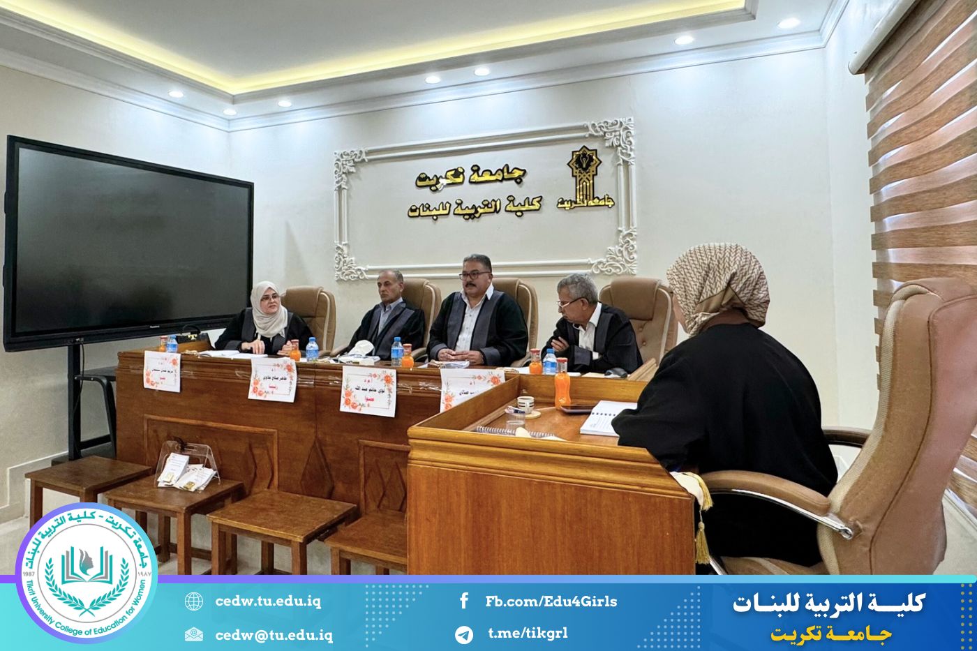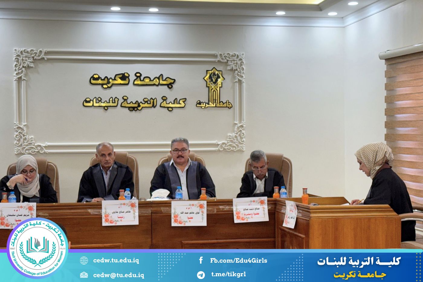 نوقشت في كلية التربية للبنات – قسم اللغة العربية، اليوم الأحد الموافق 31 / 8 / 2025، على قاعة السمنار في الأقسام العلمية، رسالة الماجستير المقدمة من الطالبة نبأ أحمد رزوقي، والموسومة: