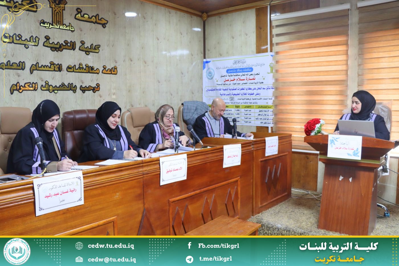نوقشت في كلية التربية للبنات جامعة تكريت قسم علوم الحياة اليوم الإثنين الموافق ٣ / ٣ / ٢٠٢٥ ، وعلى رحاب السمنار - الأقسام العلمية