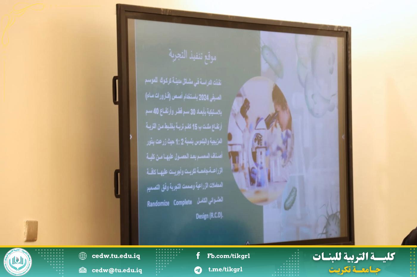 (تقييم أداء أصناف متعددة من نبات السمسم في مواعيد زراعة مختلفة)، وذلك على رحاب قاعة السمنار في بناية الأقسام العلمية.