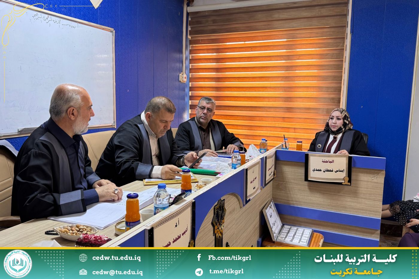 وفي ختام جلسة المناقشة، قررت اللجنة قبول الرسالة ومنح الطالبة إيناس قحطان حمدي درجة الماجستير في علوم القرآن، بعد إجراء التعديلات التي أوصت بها اللجنة.