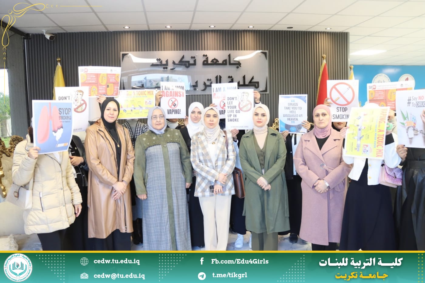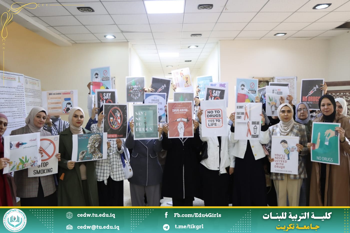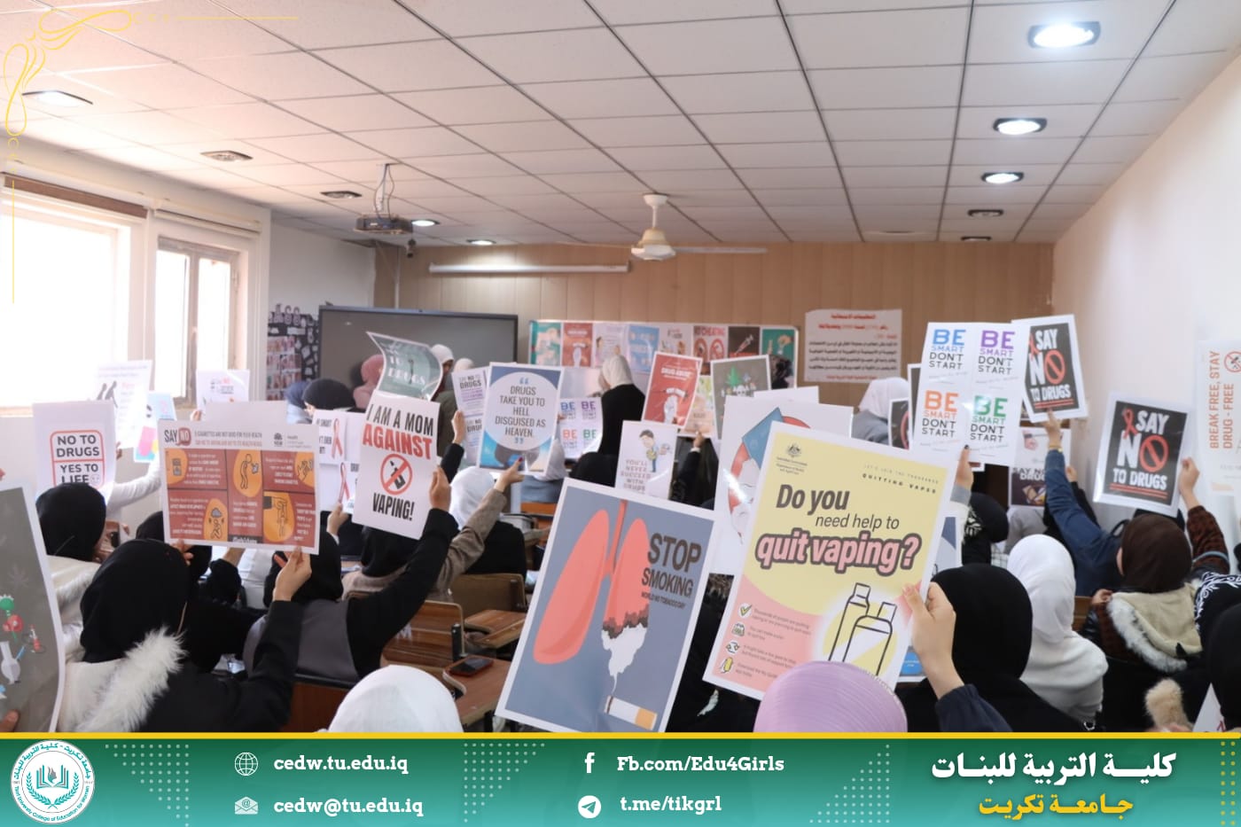 نظمت وحدة الإرشاد النفسي والتوجيه التربوي في كلية التربية للبنات بالتعاون مع قسم اللغة الإنكليزية مجموعة من النشاطات التوعوية وذلك بتوزيع بوسترات تخص بعض الظواهر السلبية في المجتمع كتعاطي المخدرات والتدخين والغش، كونها من الظواهر التي تلقي بتأثيراتها السلبية على سلامة المجتمع وتأتي هذه النشاطات التوعوية لحماية وتحصين طالباتنا من هذه الآفة الخطيرة، كما تم تسليط الضوء على بعض القضايا المهمة في المجتمع مثل بر الوالدين وموضوع الثقة والأمانة، وكان هنالك مشاركة للفيف من طالبات المرحلة الرابعة برفع هذه البوسترات في أروقة الكلية للتوعية بخطورة هذه الظواهر والعمل على الحد منها للحفاظ على سلامة مجتمعنا.