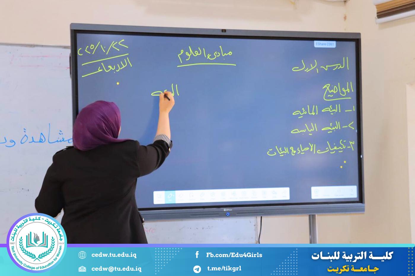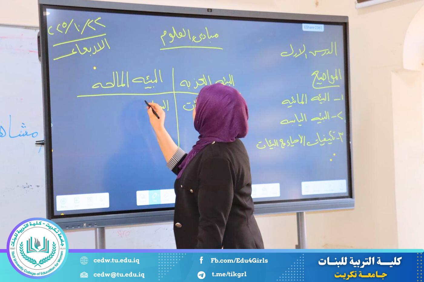 تم تنفيذ المحاضرة باستخدام الشاشة الذكية، حيث عرضت الطالبات نماذج تعليمية تفاعلية تناولت موضوعات من مجال التربية الأسرية والتغذية والتصميم الداخلي، مع توظيف أساليب عرض حديثة تعزز من التواصل بين المعلم والمتعلم داخل الصف.