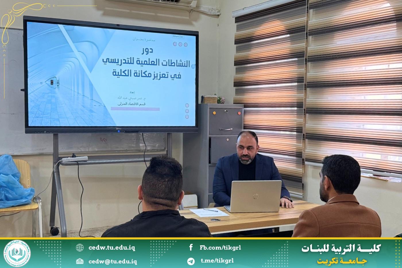 اقامت كلية التربية للبنات/ قسم الاقتصاد المنزلي بالتعاون مع قسم الشؤون العلمية ومركز التعليم المستمر، محاضرة بعنوان : النشاطات العلمية للتدريسي في تعزيز مكانة الكلية، وذلك اليوم الاثنين الموافق ١٠ / ٢ / ٢٠٢٥ على رحاب قاعة قسم الاقتصاد المنزلي