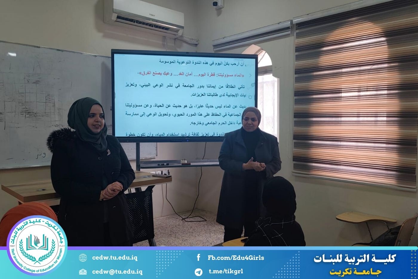 نظّمت وحدة الإرشاد النفسي والتوجيه التربوي، بالتعاون مع قسم الاقتصاد المنزلي في كلية التربية للبنات بجامعة تكريت، ندوة إرشادية بعنوان «الماء مسؤوليتنا… قطرة ماء أمان الغد»، وذلك يوم الأحد الموافق ٢٨ / ١٢ / ٢٠٢٥، على رحاب قاعة قسم الاقتصاد المنزلي، وبمشاركة عدد من التدريسيات والطالبات.