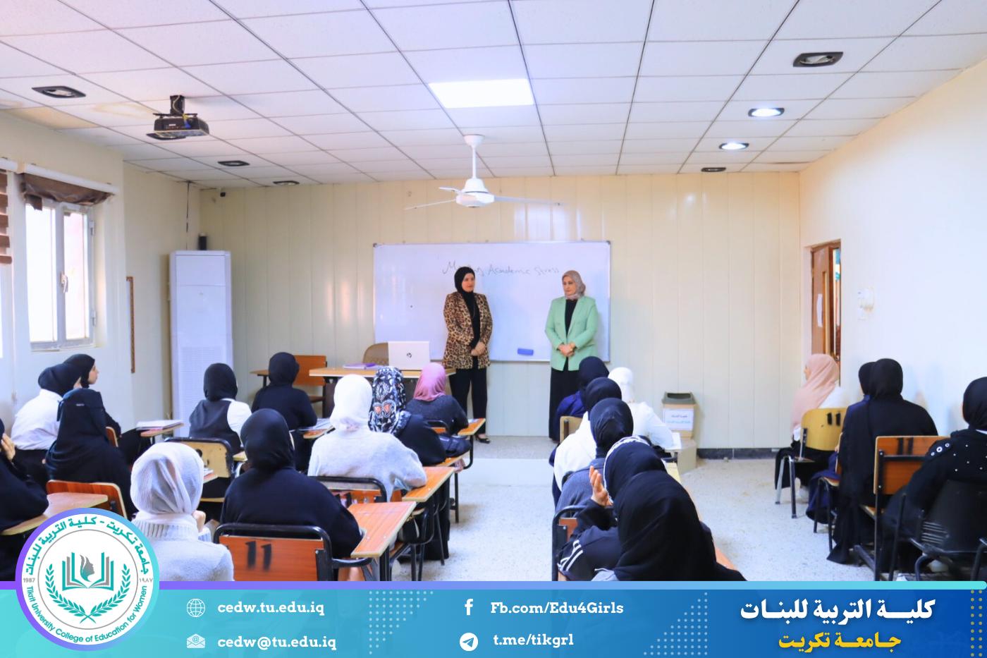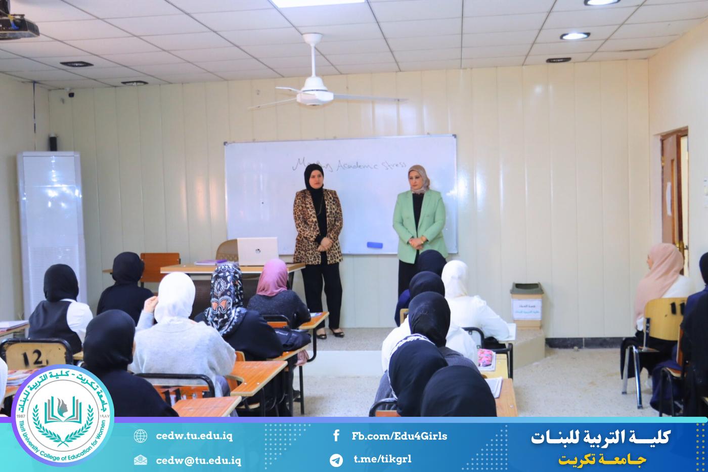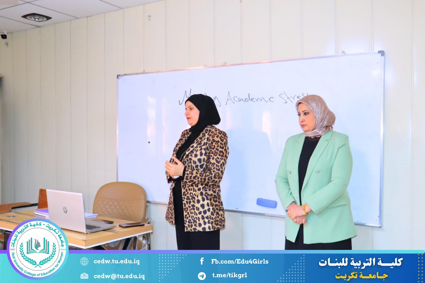 نظّم قسم اللغة الإنكليزية في كلية التربية للبنات – جامعة تكريت، وبالتعاون مع مركز التعليم المستمر في جامعة تكريت، دورةً علميةً بعنوان: «Managing Academic Stress: Strategies for Success»، وذلك على مدى يومي الثلاثاء والأربعاء الموافقين 10–11 / 3 / 2026، وعلى رحاب قاعات قسم اللغة الإنكليزية، بمشاركة عدد من طالبات القسم.