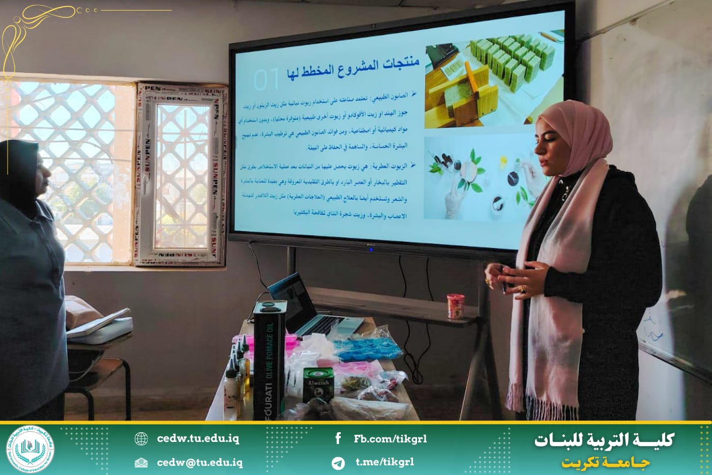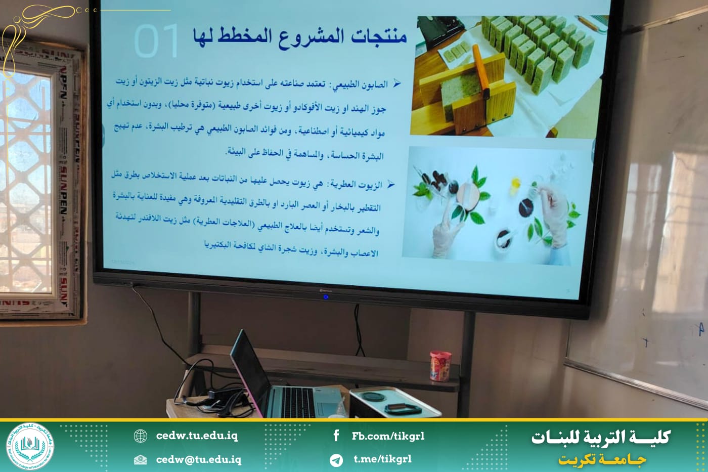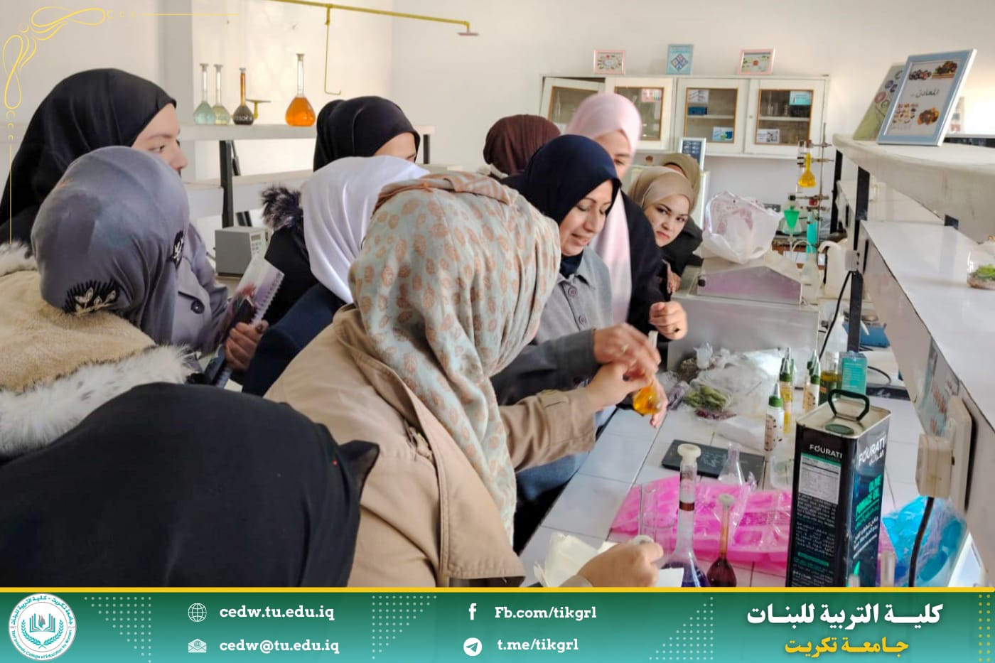 بدأت دورة اليوم الاول في قسم الكيمياء عن كيفية صناعة الصابون الطبيعي والزيوت العطرية الصديقة للبيئة حيث تضمنت جانب نظري وافي وخطة العمل ومن ثم التطبيق المباشر في المختبر