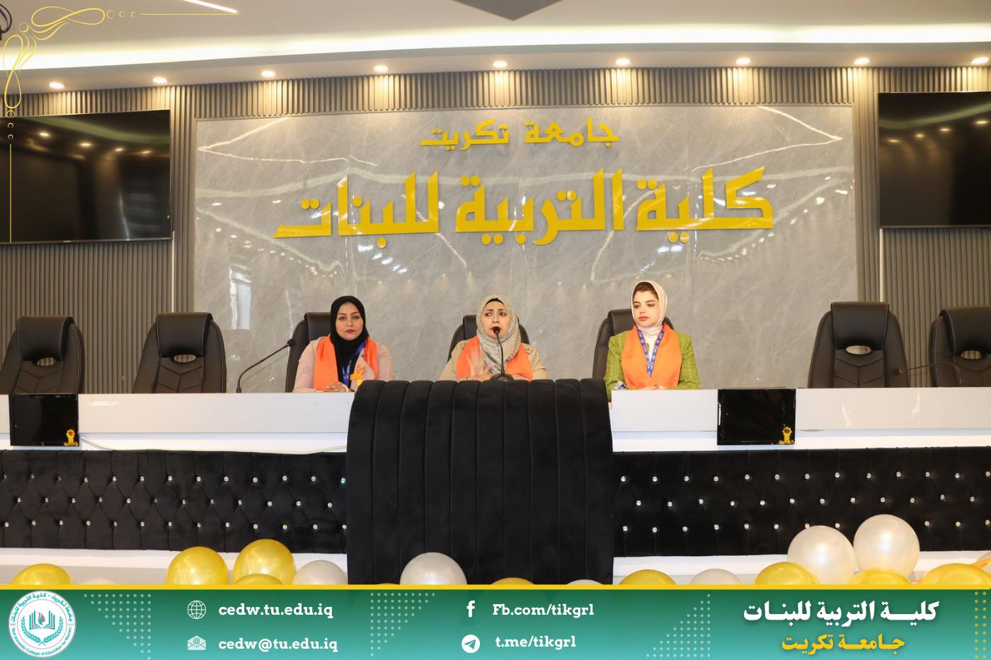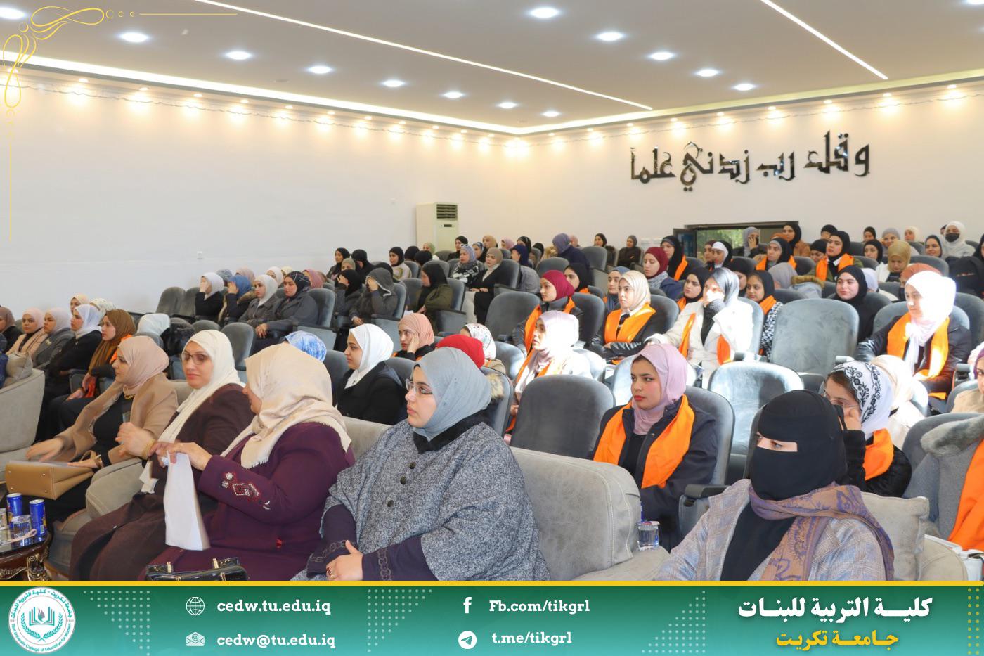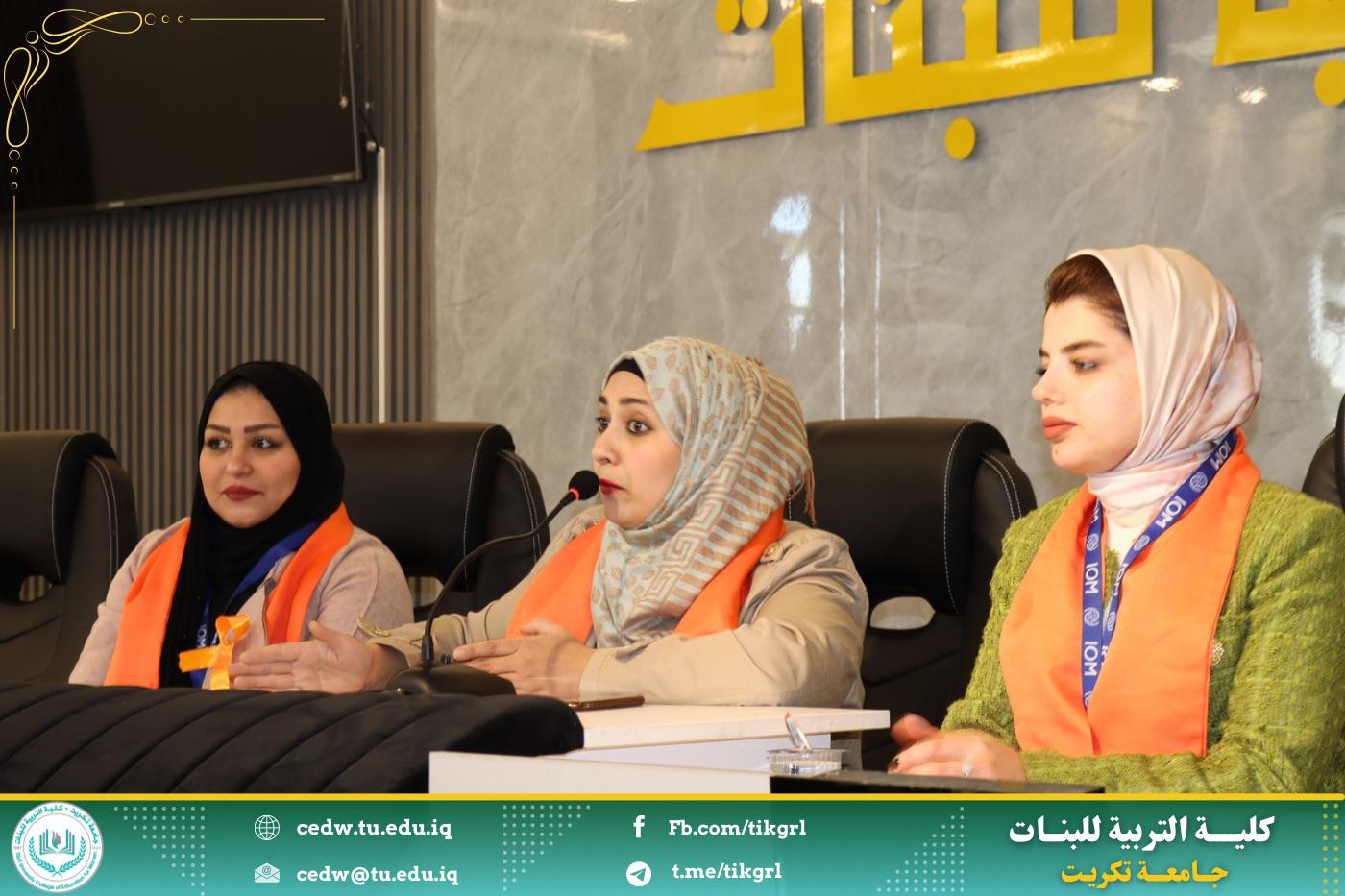 برعاية الأستاذ الدكتور وعد محمود رؤوف المحترم رئيس جامعة تكريت وبإشراف الأستاذ الدكتورة نجلاء عبدالحسين عليوي المحترمة عميد كلية التربية للبنات اقامت كلية التربية للبنات وحدة شؤون المرأة بالتعاون مع وكالة الامم المتحدة للهجرة ورشه عمل بعنوان : (العنف ضد المرأة واثره في هدم المجتمع) تحت شعار: كل يد تؤذي يجب ان توقف