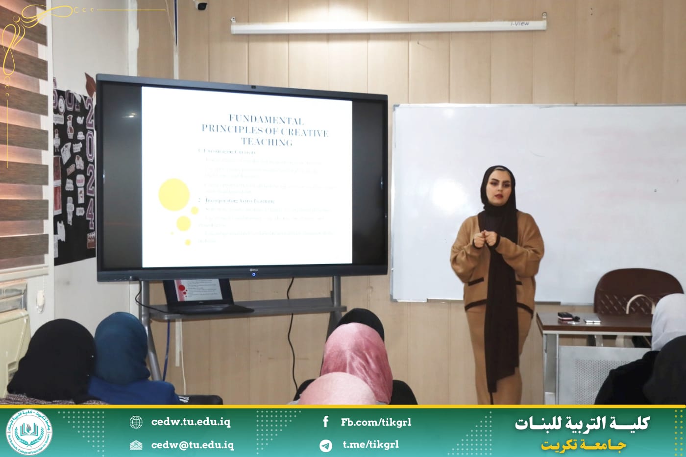 برعاية الأستاذ الدكتور وعد محمود رؤوف رئيس جامعة تكريت وبإشراف الأستاذ الدكتورة نجلاء عبدالحسين عليوي عميد كلية التربية للبنات والاستاذ المساعد الدكتور سياف عبد حسين مدير مركز التعليم المستمر وبالتعاون مع كلية التربية للبنات دورة تدريبية بعنوان : The Art of teaching: Creative Approaches for English Teaching يومي الاثنين والثلاثاء 2-3/ 12/ 2024 على قاعة المرحلة الرابعة في قسم اللغة الانجليزية
