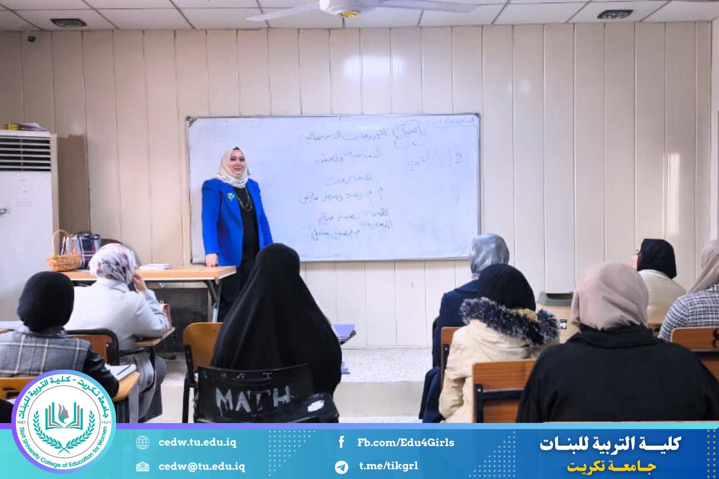 نظّم قسم الرياضيات في كلية التربية للبنات بجامعة تكريت، وبالتعاون مع مركز التعليم المستمر، دورة علمية بعنوان «التوزيعات الاحتمالية الأساسية والمتقدمة»، وذلك على مدى ثلاثة أيام (الاثنين والثلاثاء والأربعاء) الموافق ١٢–١٣–١٤ / ١ / ٢٠٢٦، وعلى رحاب قاعة المرحلة الثانية – قسم الرياضيات.