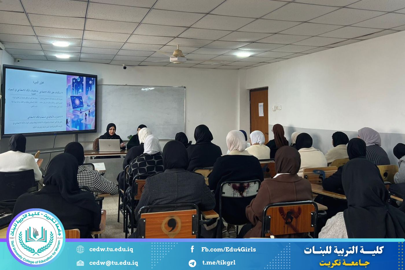 أقامت كلية التربية للبنات - قسم الكيمياء، وبالتعاون مع مركز التعليم المستمر، دورة علمية بعنوان (تأثير الذكاء الاصطناعي على مستويات المجال البحثي)، وذلك للأيام الثلاثاء والأربعاء والخميس الموافق 13–14–15 / 1 / 2026، وعلى قاعة المرحلة الرابعة - قسم الكيمياء في بناية الأقسام العلمية