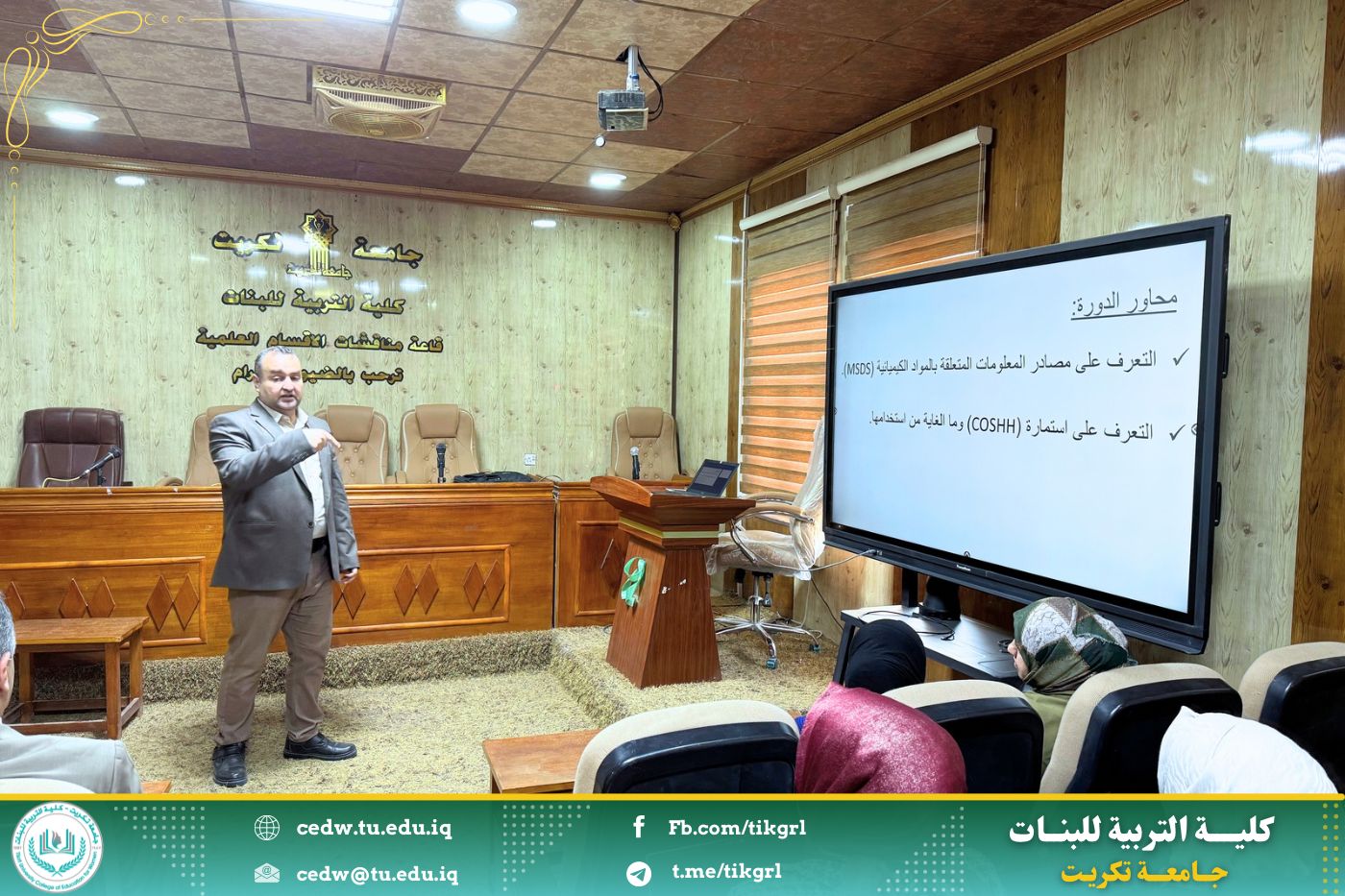 اقام مركز التعليم المستمر بالتعاون مع كلية التربية للبنات دورة تدريبية تعليمية بعنوان : التعامل الآمن مختبرياً مع المواد الكيمياوية، وذلك ليومي الثلاثاء والأربعاء الموافق ١٨ - ١٩ / ٢ / ٢٠٢٥ على رحاب قاعة السمنار - بناية الأقسام العلمية