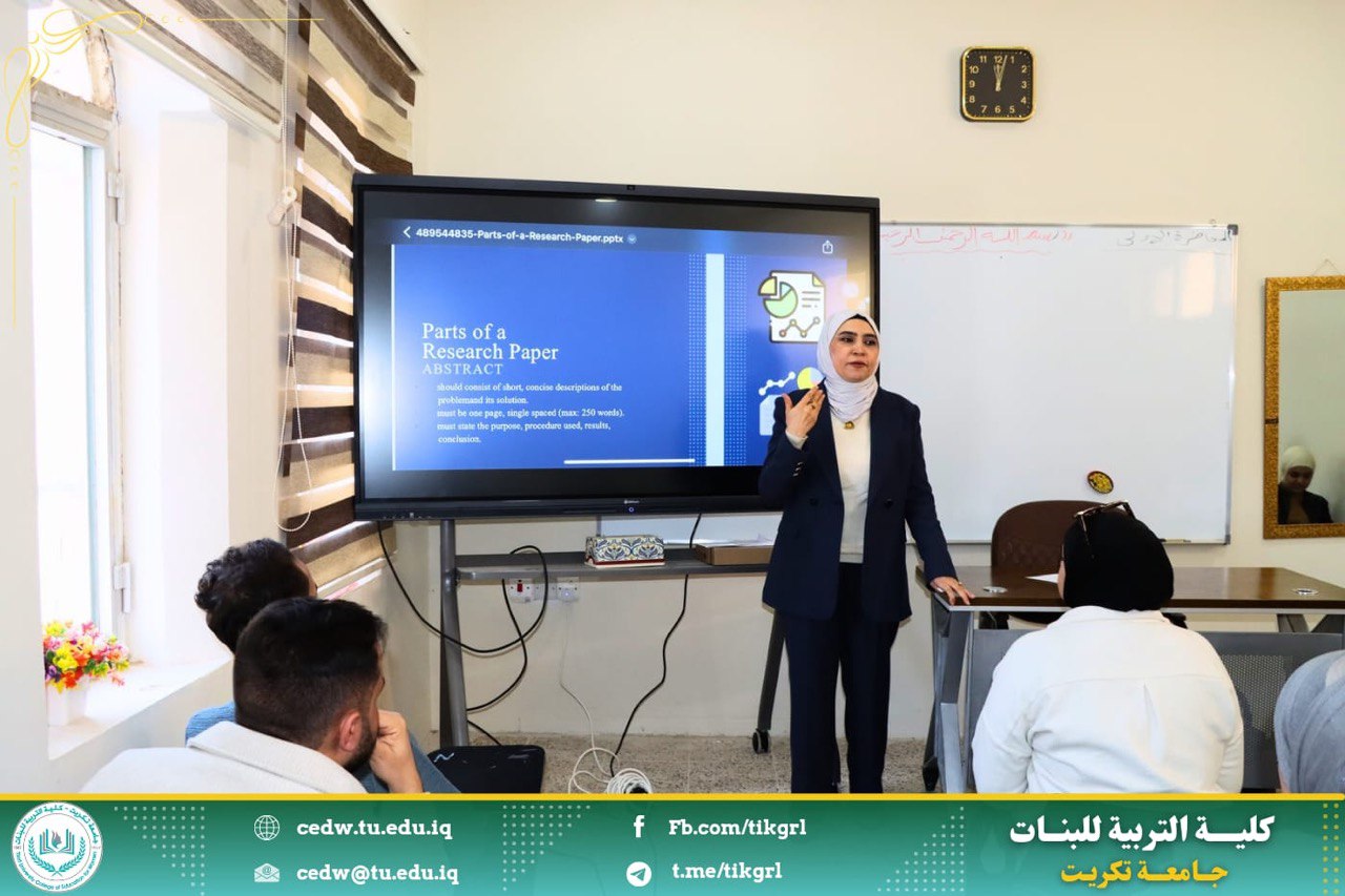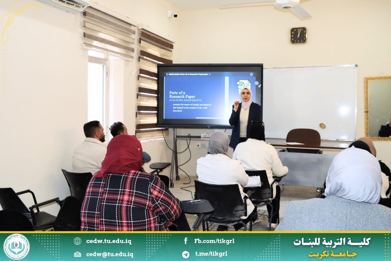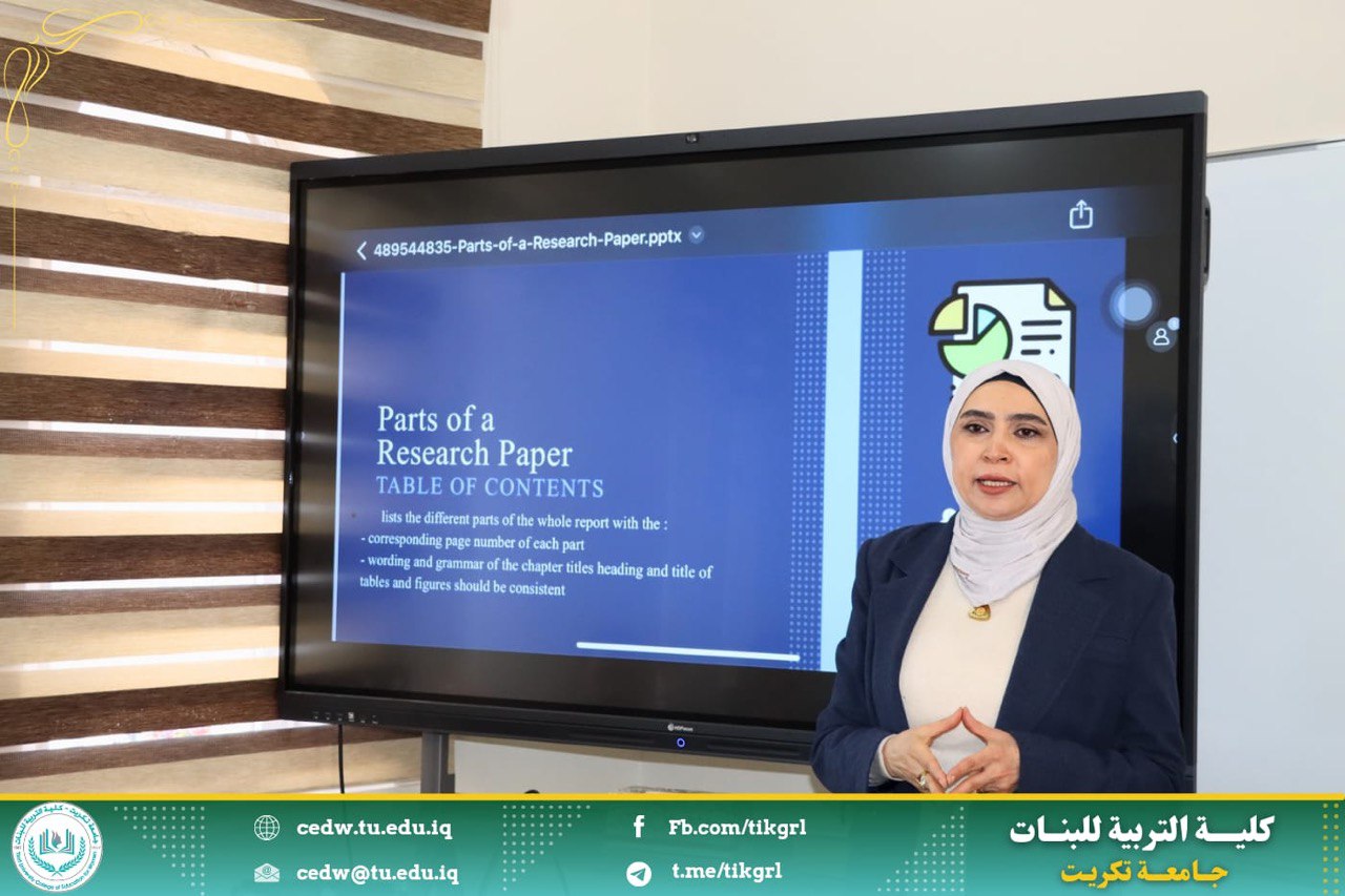 أقامت كلية التربية للبنات قسم اللغة الإنكليزية ورشة عمل بعنوان: (Parts of a Research Paper) في يوم الاثنين الموافق 23/ 12/ 2024 على قاعة قسم اللغة الإنكليزية