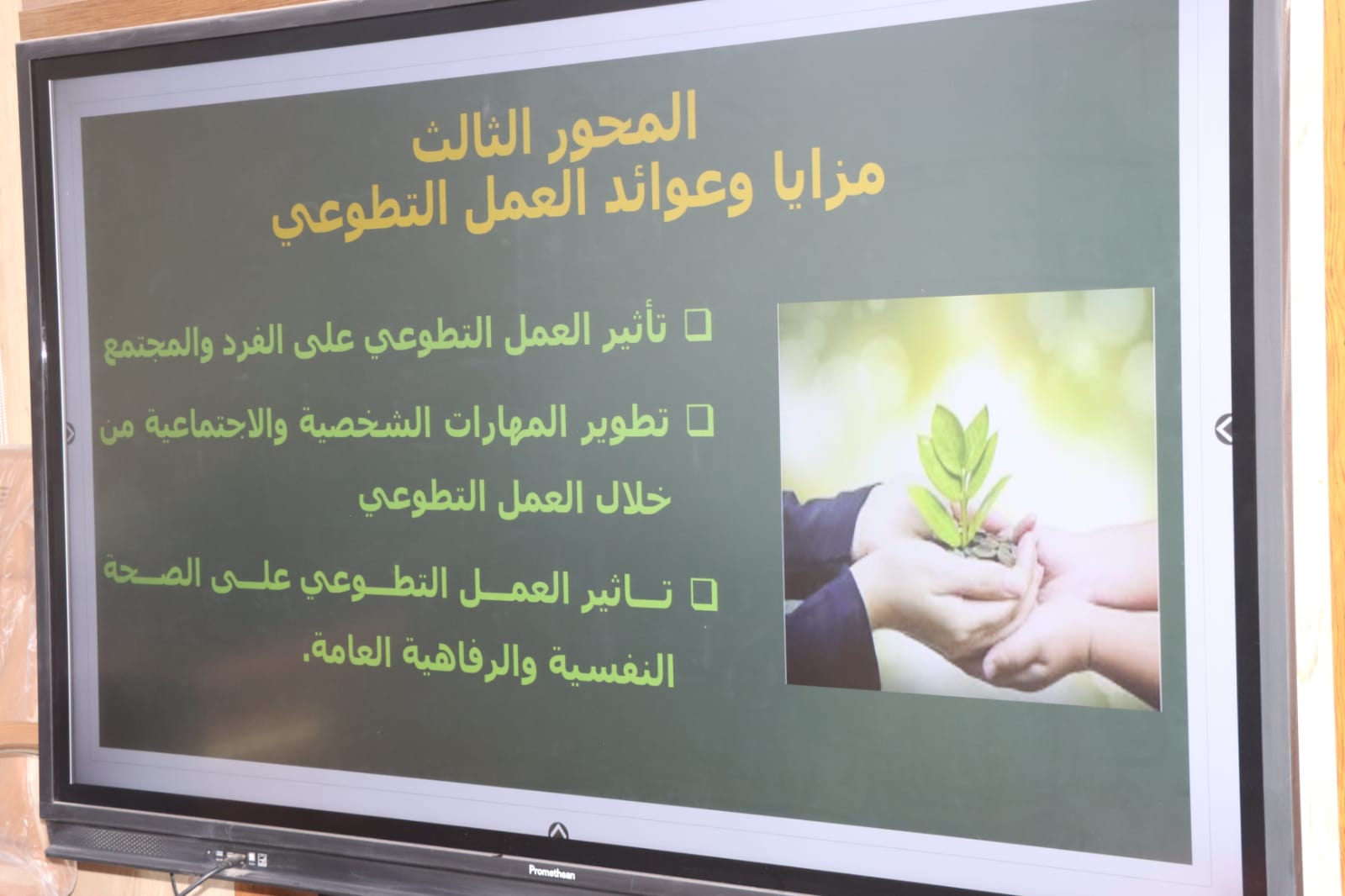 * تعريف الحضور بأهمية العمل التطوعي ودوره في تنمية المهارات الشخصية والاجتماعية والاكاديمية