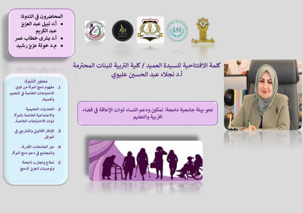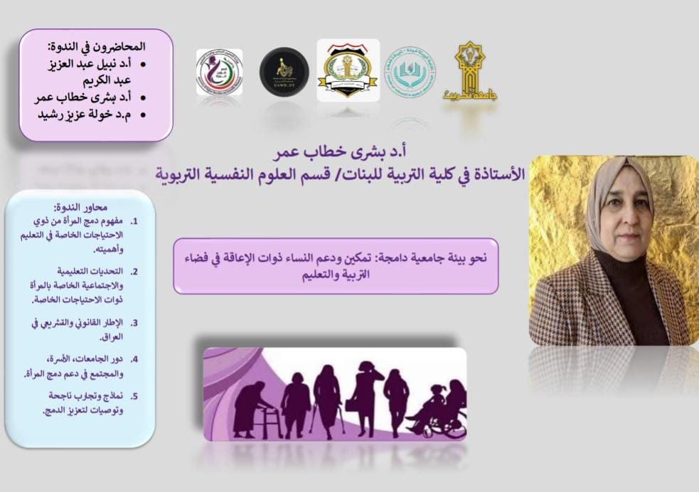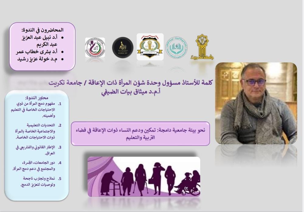 أقامت كلية التربية للبنات بالتعاون مع مركز التعليم المستمر ووحدة شؤون المرأة ذات الإعاقة في جامعة تكريت ، ندوة علمية موسومة: