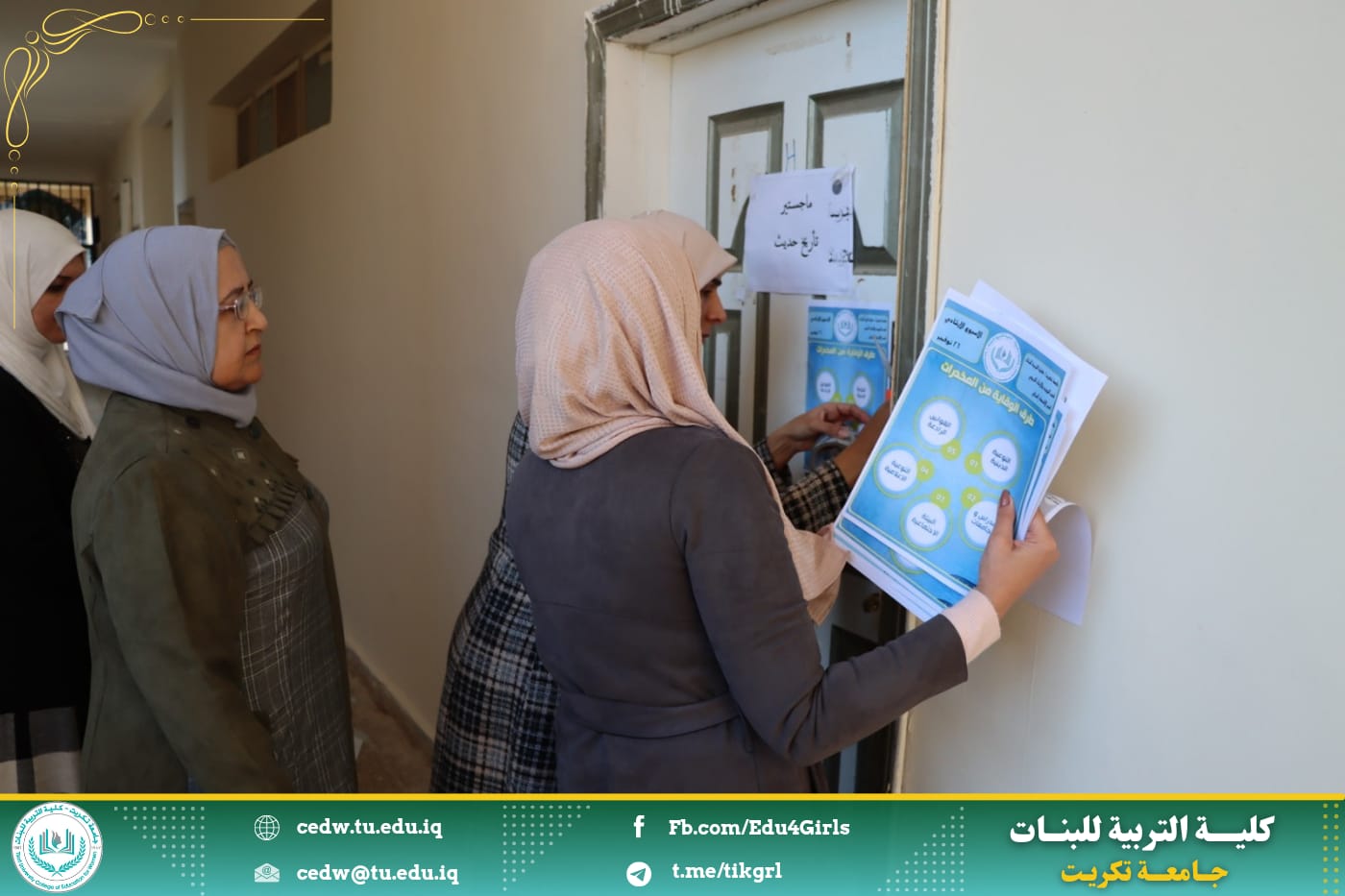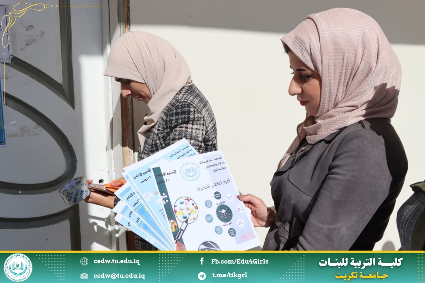 نظمت وحدة الإرشاد النفسي والتوجيه التربوي في كلية التربية للبنات بالتعاون مع قسم الاقتصاد المنزلي حملة ضد المخدرات من خلال عمل بوسترات توعوية عن المخدرات وتعليقها على أروقة الكلية، وهدفت الحملة إلى بيان أهمية الموضوع والخطورة التي تنطوي عليها الظاهرة والتي تشكل تهديداً حقيقياً للمجتمع كونها تستهدف أهم عنصر فيه وهم فئة الشباب الذين يمثلون الدعامة الأساسية التي يقوم ويرتكز عليها، مما ينعكس سلبًا على النواحي المختلفة بالتنمية الاجتماعية والاقتصادية التي ينشدها المجتمع ، وشاركت طالبات قسم الاقتصاد المنزلي في هذه الحملة من خلال رفع البوسترات داخل قاعاتهم الدراسية للتعبير عن مساهمتهم ودعمهم لمثل هذه الحملات التوعوية.