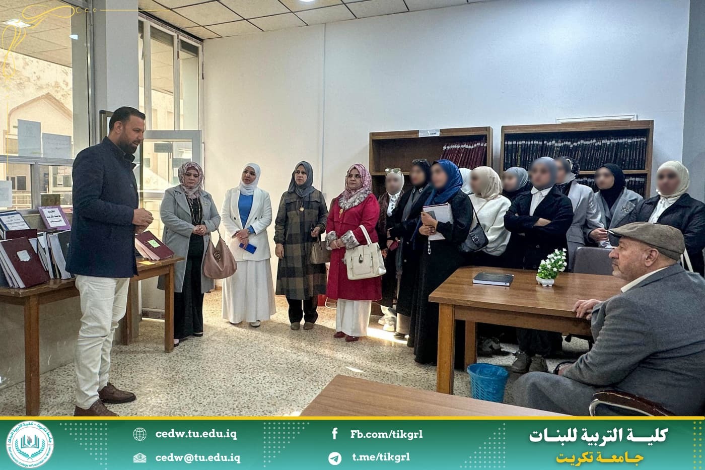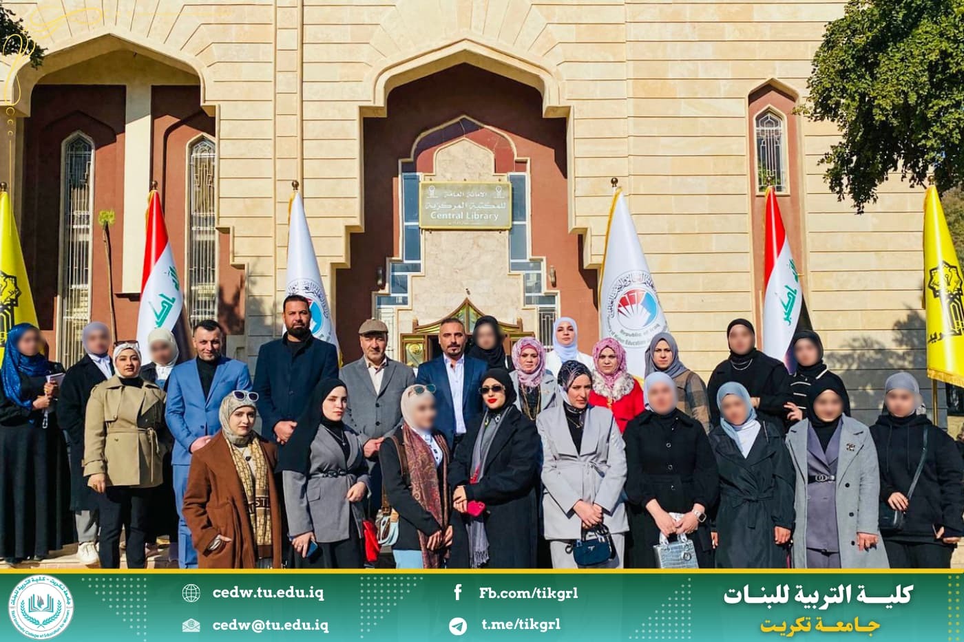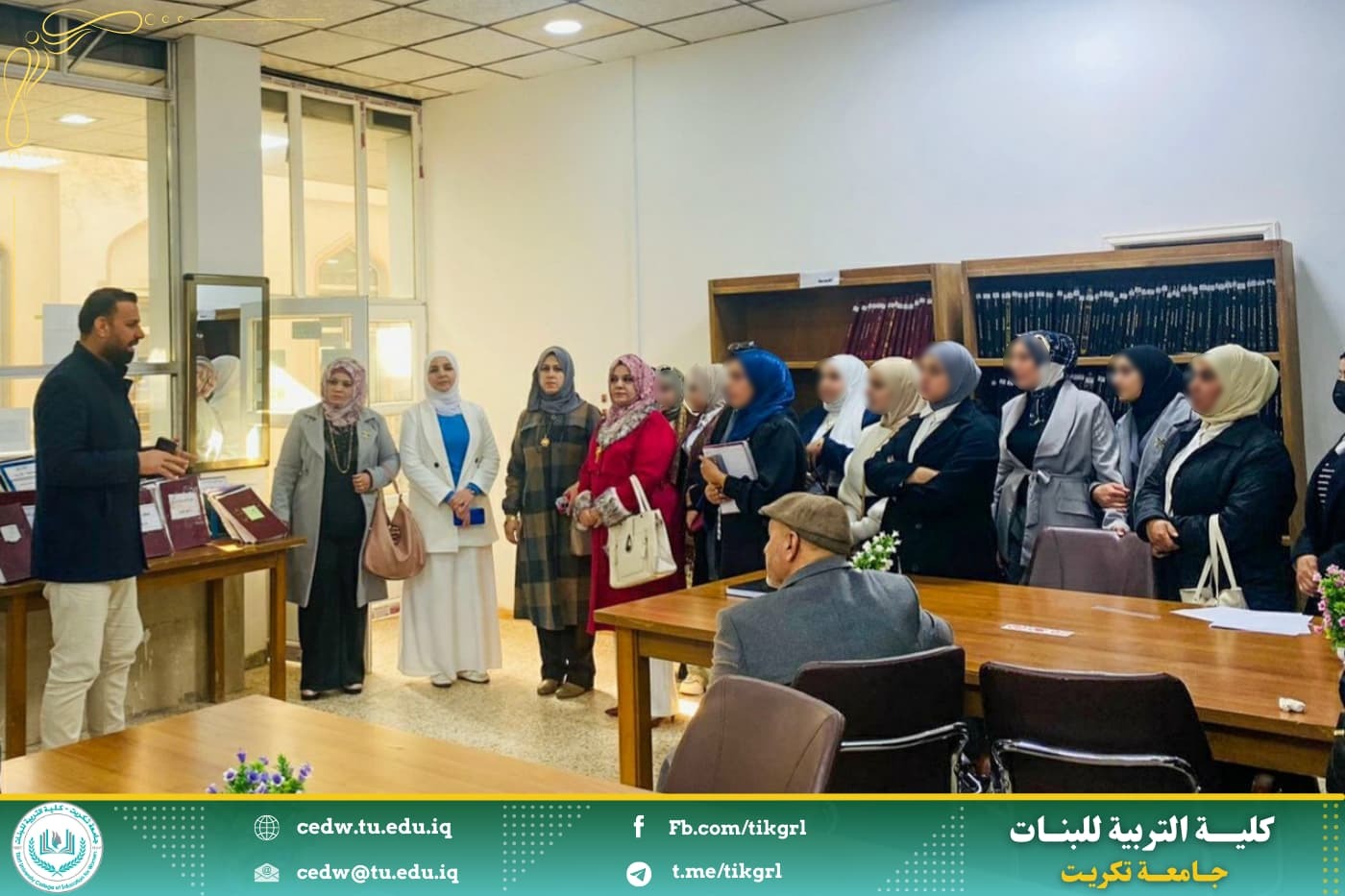 وقد استقبلهم وبكل حفاوة كادرها الاداري والفني وفي مقدمتهم المدرس الدكتور محمد احمد ذياب المحترم الأمين العام للمكتبة المركزية حيث رحب بالوفد أطيب ترحيب وقدم لهم كل التسهيلات الإنسانية والعلمية الراقية التي تدعم الزيارة وتخدم نشاط القسم كما تم التجول في أروقة المكتبة والتعرف على أقسامها والخدمات التي توفرها لطالباتنا العزيزات