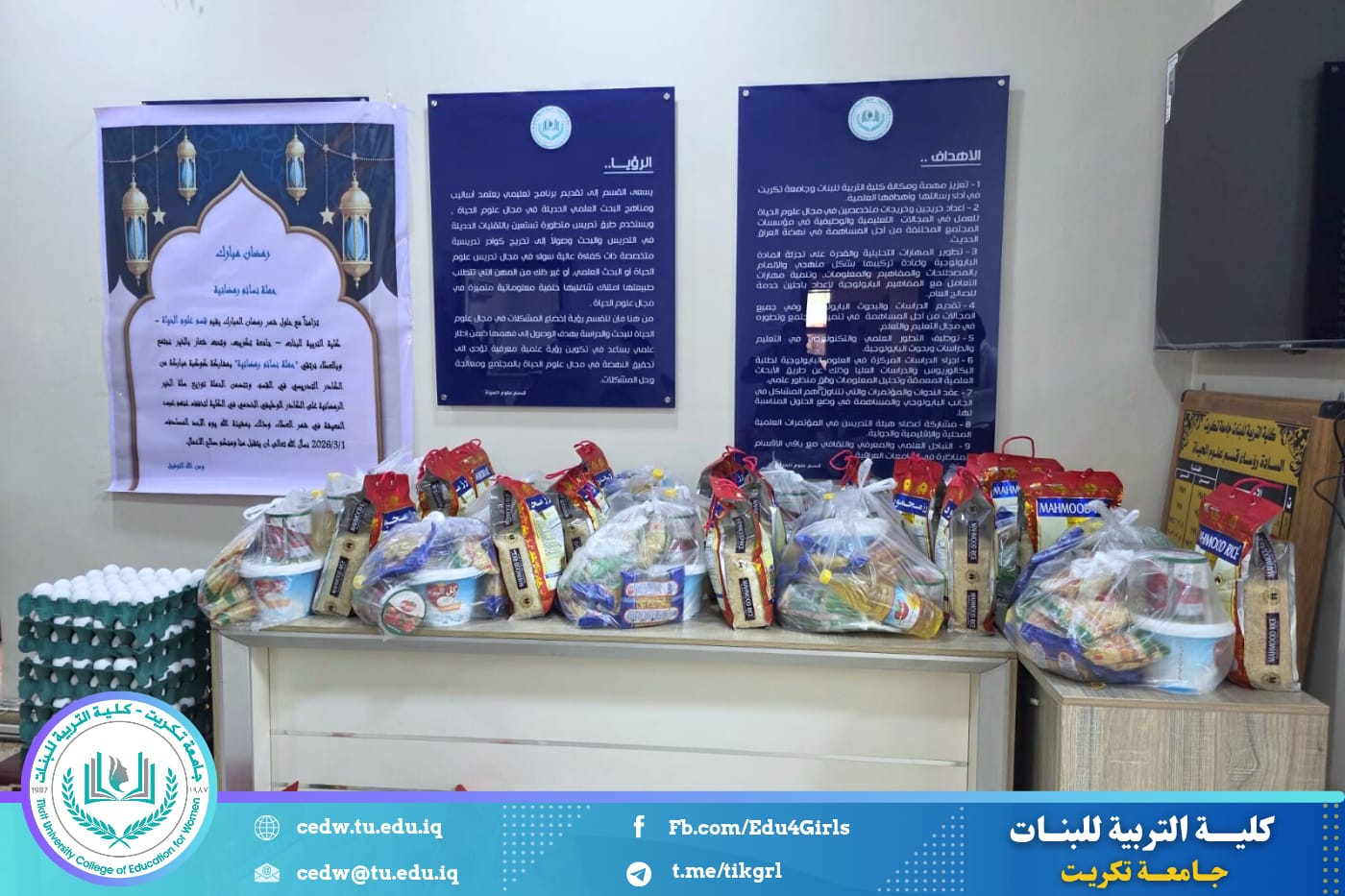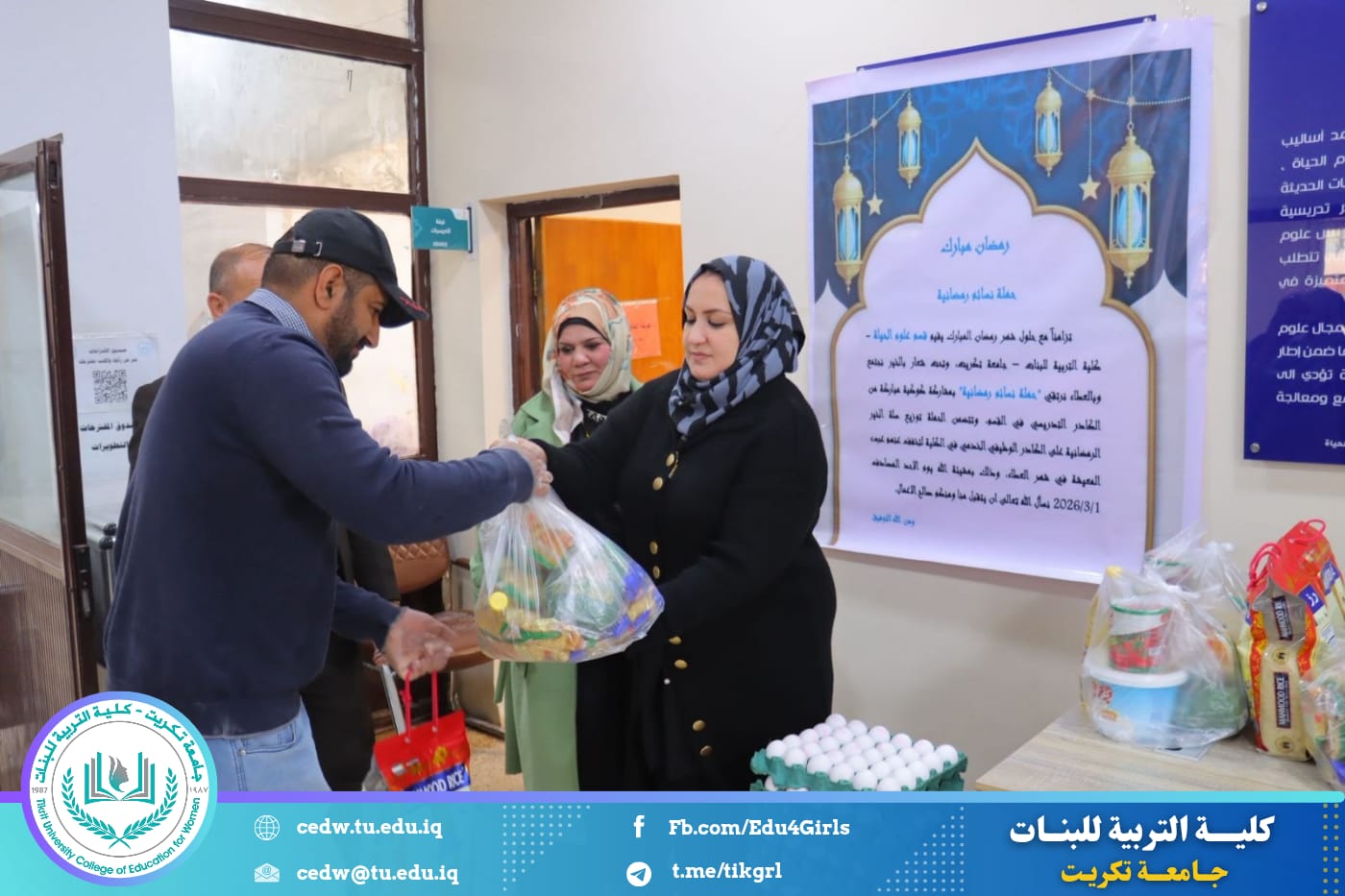 تزامناً مع حلول شهر رمضان المبارك، أقام قسم علوم الحياة في كلية التربية للبنات – جامعة تكريت حملة رمضانية نسوية تحت شعار (بالخير نجتمع وبالعطاء نرتقي)، بمشاركة كوكبة من الكادر التدريسي في القسم، وذلك في إطار تعزيز قيم التكافل الاجتماعي وترسيخ روح التعاون والعطاء خلال هذا الشهر الفضيل.