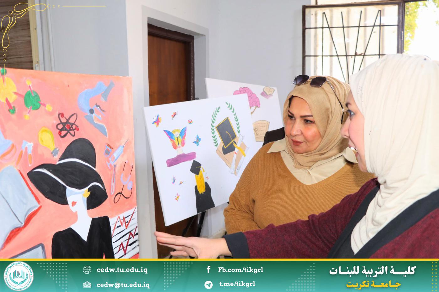 * عرضاً لللوحات الفنية التي توضح ان العلم هو غذاء العقل وان المرأة المتعلمة تفتح لها افاق كثيرة ومجالات عديدة تعزز من دورها بالمجمع