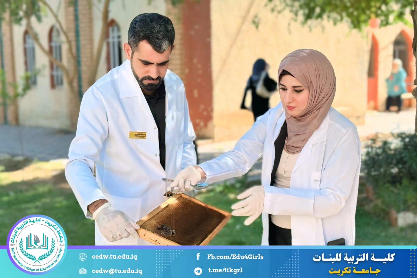 ضمن إطار النشاطات التطبيقية لقسم الاقتصاد المنزلي في كلية التربية للبنات – جامعة تكريت، أجرت المدرس شهد خالد حميد رئيس القسم، اليوم الثلاثاء الموافق ١٤ / ١٠ / ٢٠٢٥، وبالتعاون مع م.د. فلاح سالم داوود أحد تدريسي القسم، متابعة ميدانية لخلايا النحل الخاصة بالدرس العملي لتخصص الغذاء والتغذية.