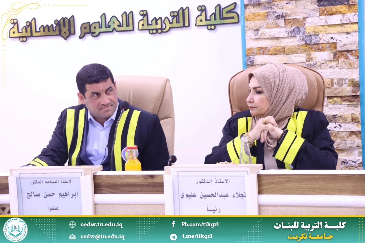 ترأست الأستاذ الدكتورة نجلاء عبدالحسين عليوي عميد كلية التربية للبنات / جامعة تكريت ، لجنة مناقشة رسالة ماجستير خارجية للطالبة ( فاطمة زاحم حارز ) في كلية التربية للعلوم الانسانية ، الموسومة (تجليات البداوة والحضارة في شعر ابن دراج القسطلي) ، والتي نوقشت صباح اليوم الثلاثاء الموافق ١٨ / ٢ / ٢٠٢٥ على رحاب قاعة كلية التربية للعلوم الإنسانية - جامعة تكريت