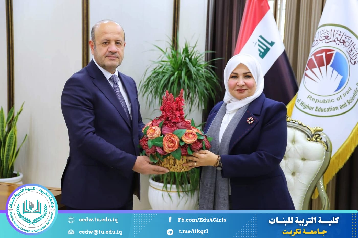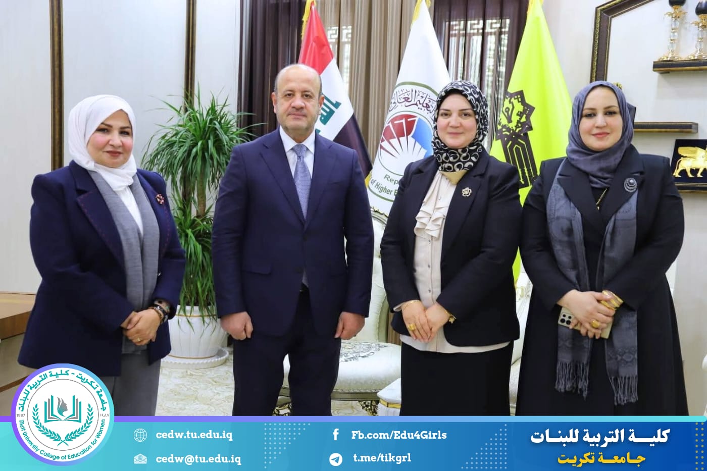 في إطار تعزيز أواصر التعاون المؤسسي وترسيخ روح العمل المشترك، زارت السيدة عميد كلية التربية للبنات في جامعة تكريت، الأستاذ الدكتورة نجلاء عبدالحسين عليوي، السيد رئيس جامعة تكريت الأستاذ الدكتور وعد محمود رؤوف في مكتبه، لتقديم التهاني بمناسبة تثبيته رئيسًا للجامعة.