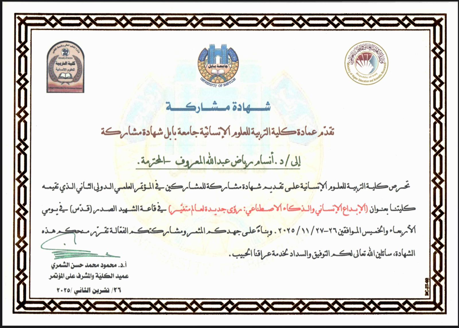 وقد منحت اللجنة المنظمة شهادة مشاركة تقديرية تثميناً لجهودها البحثية ومشاركتها الفاعلة في أعمال المؤتمر، كما ورد في الوثيقة الرسمية الصادرة عن كلية التربية للعلوم الإنسانية.