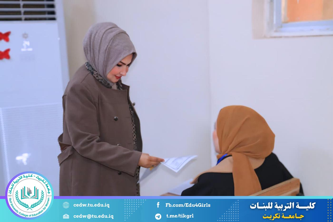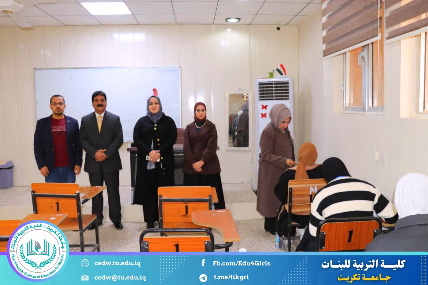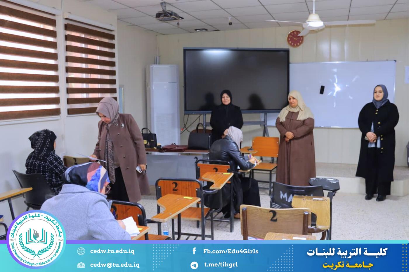 أجرت السيدة عميد كلية التربية للبنات، الأستاذ الدكتورة نجلاء عبدالحسين عليوي، صباح اليوم الثلاثاء الموافق ٢٣ / ١٢ / ٢٠٢٥، جولة تفقدية على القاعات الامتحانية، لمتابعة سير امتحانات الدراسات العليا، برفقتها كل من الأستاذ الدكتورة أشرف جمال محمود معاون العميد للشؤون العلمية، والأستاذ المساعد الدكتورة سلمى خالد ياسين معاون العميد للشؤون الإدارية.