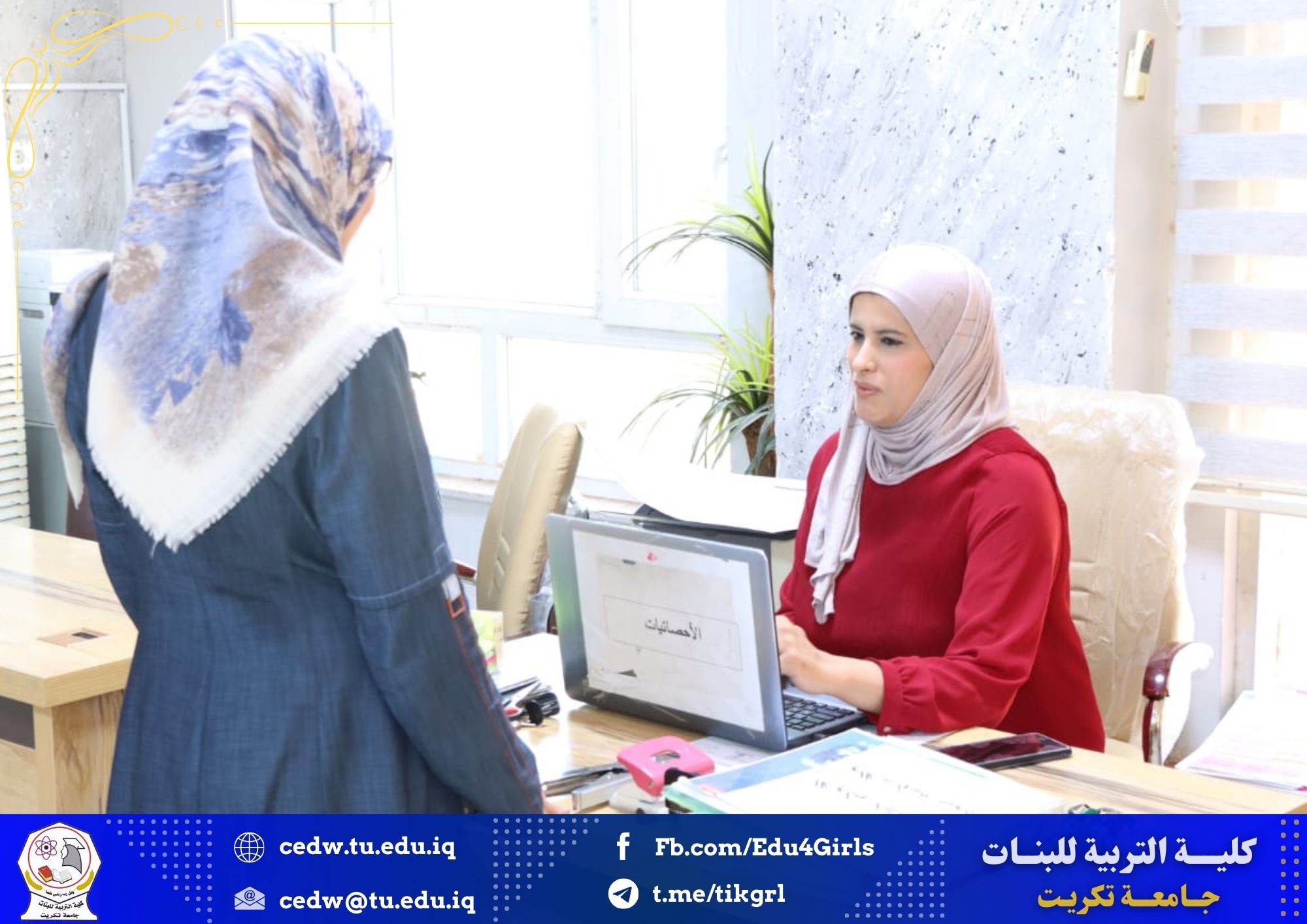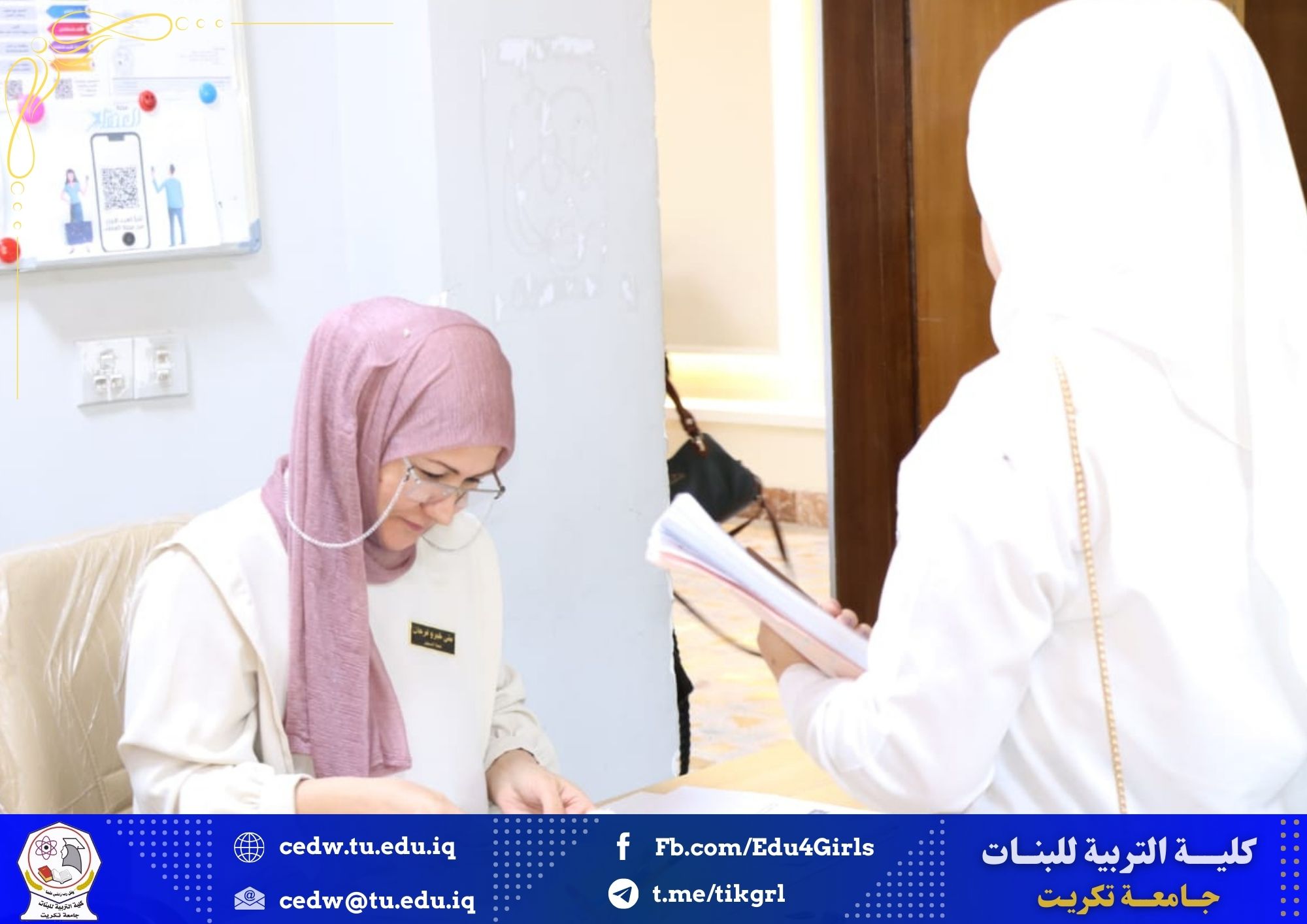 جانب من اعمال لجنة استقبال وتدقيق ملفات المتقدمات للدراسات العليا في كلية التربية للبنات جامعة تكريت للعام لدراسي 2024-2025 وذلك في يوم الاثنين الموافق 27 /5/ 2024 حيث باشرت اللجنة باستقبال الطالبات المتقدمات من جميع اقسام الكلية وتقديم كافة التسهيلات لهن
