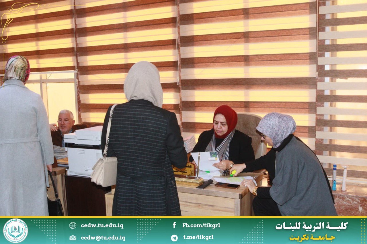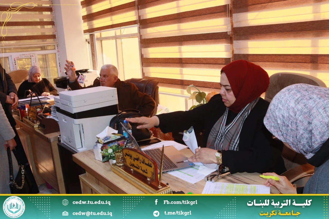استمرار شعبة التسجيل في كلية التربية للبنات باستقبال طالبات الدور الثالث المقبولات ضمن خطة القبول المركزي لوزارة التعليم العالي والبحث العلمي للعام الدراسي 2024- 2025 بتاريخ 5/ 12/ 2024 في يوم الخميس لغرض اكمال إجراءات التسجيل من تدقيق ملفات الطالبات وادراجهم في قاعدة البيانات وتقديم كافة التسهيلات والمساعدة ضمن الاطر القانونية والابتعاد عن التعقيد الاداري