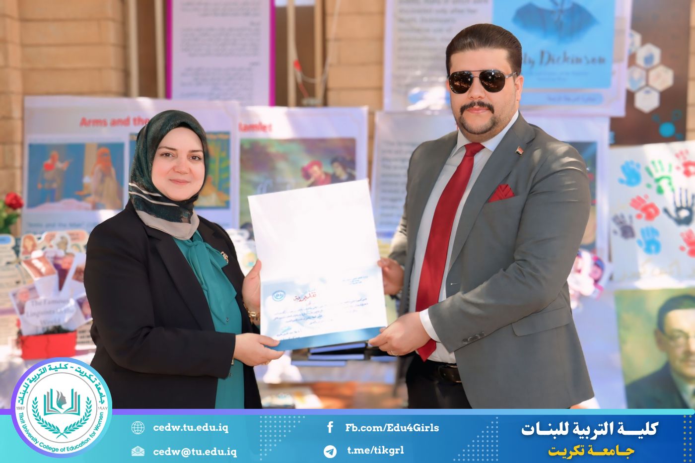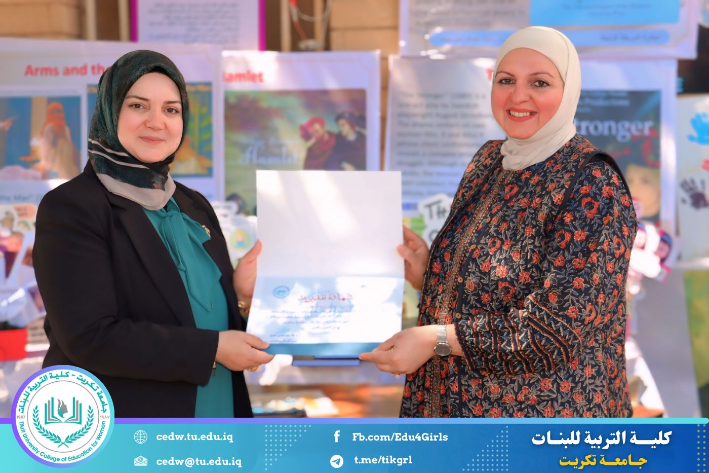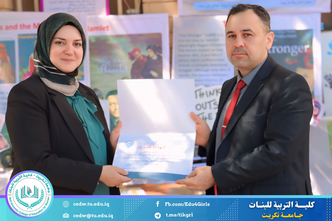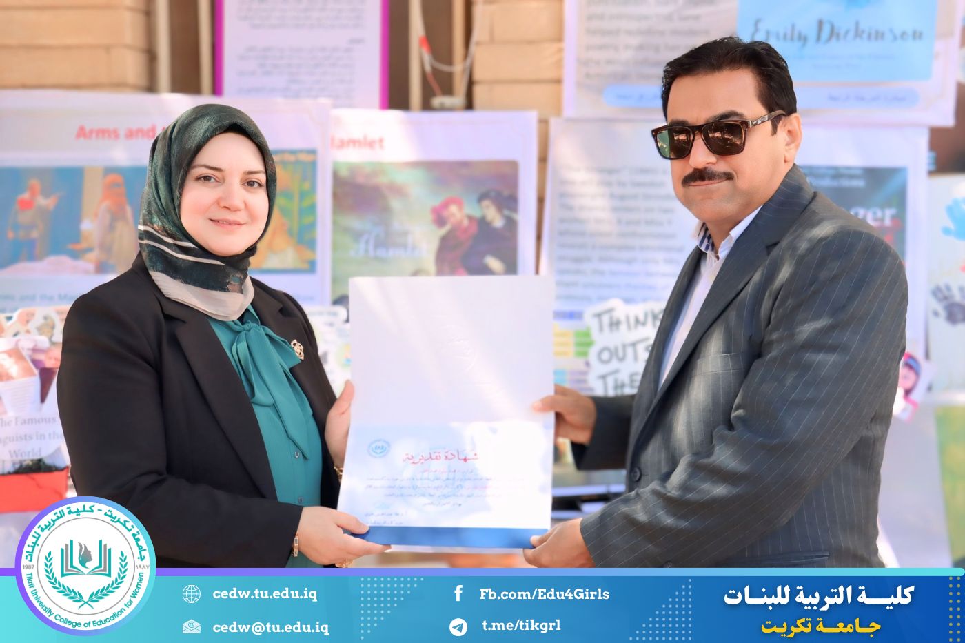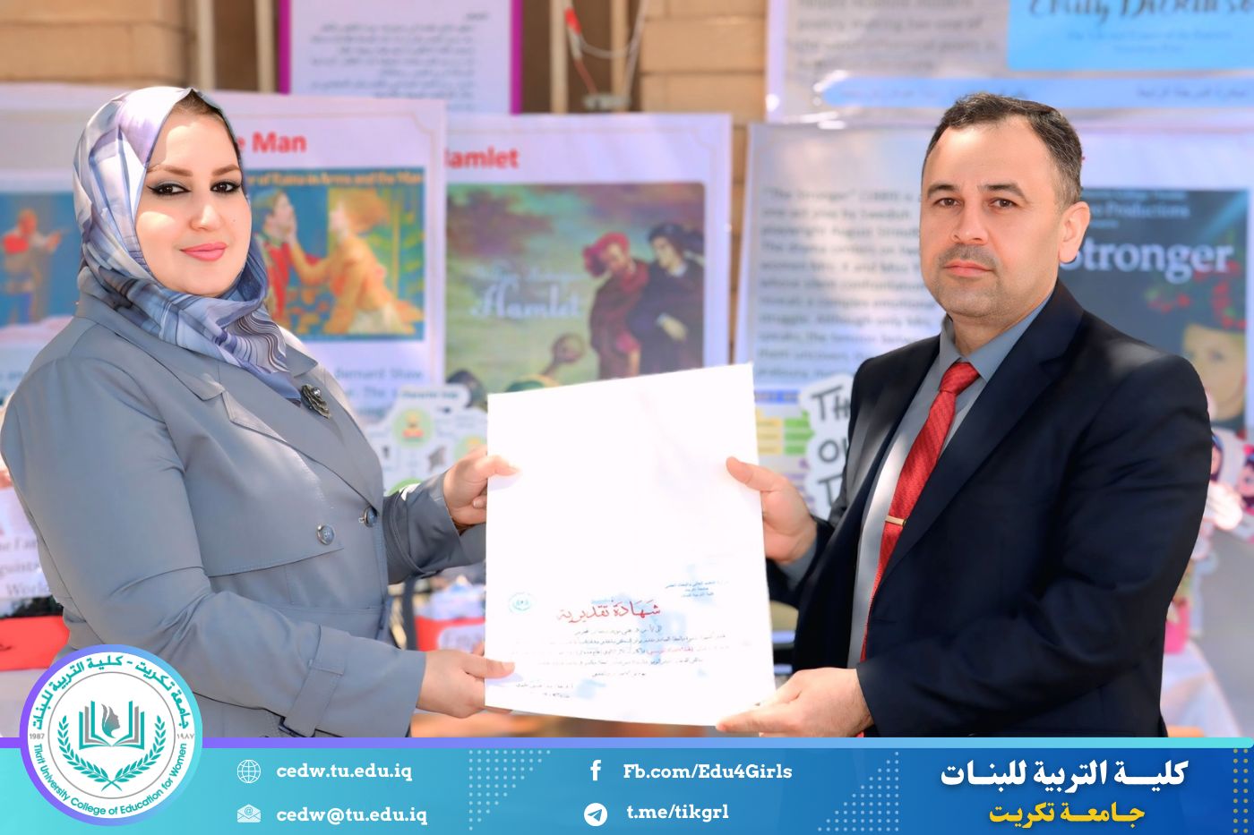 ضمن أجواء احتفالية متميزة، أقامت كلية التربية للبنات في جامعة تكريت فقرة تكريمية شاملة، كرّمت فيها نخبة من اللجان المركزية والفرعية والمساندة للاعتماد البرامجي، إلى جانب رؤساء الأقسام العلمية، ومسؤولي الشعب والوحدات، وأصحاب الألقاب العلمية الحاصلين على الترقيات العلمية، فضلاً عن مسؤولي المختبرات، وذلك بمنحهم كتب شكر وتقدير وشهادات تقديرية، تثميناً لجهودهم وعطائهم المتواصل.