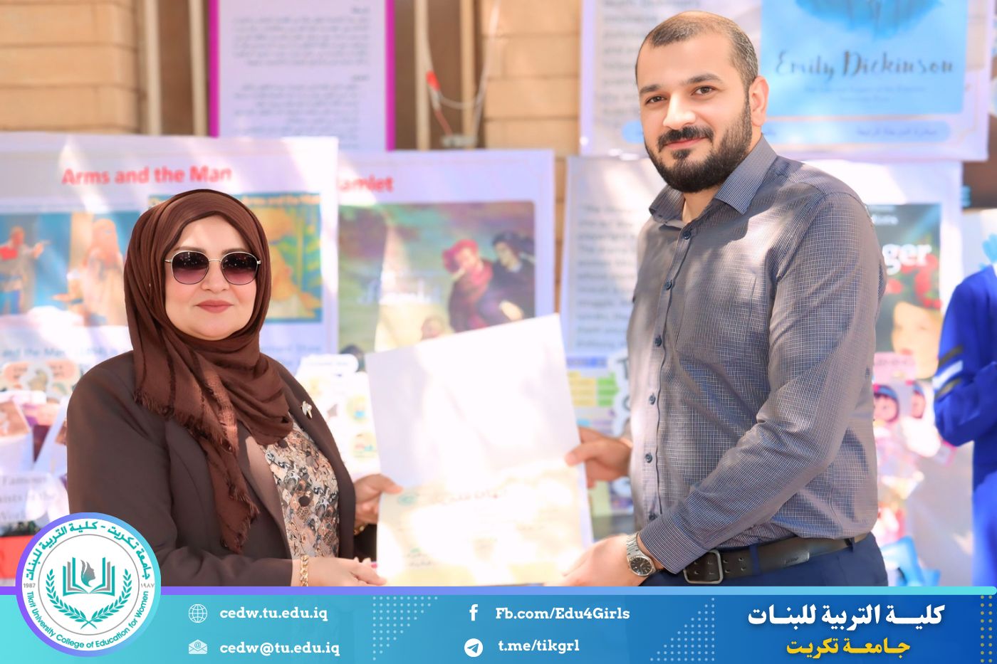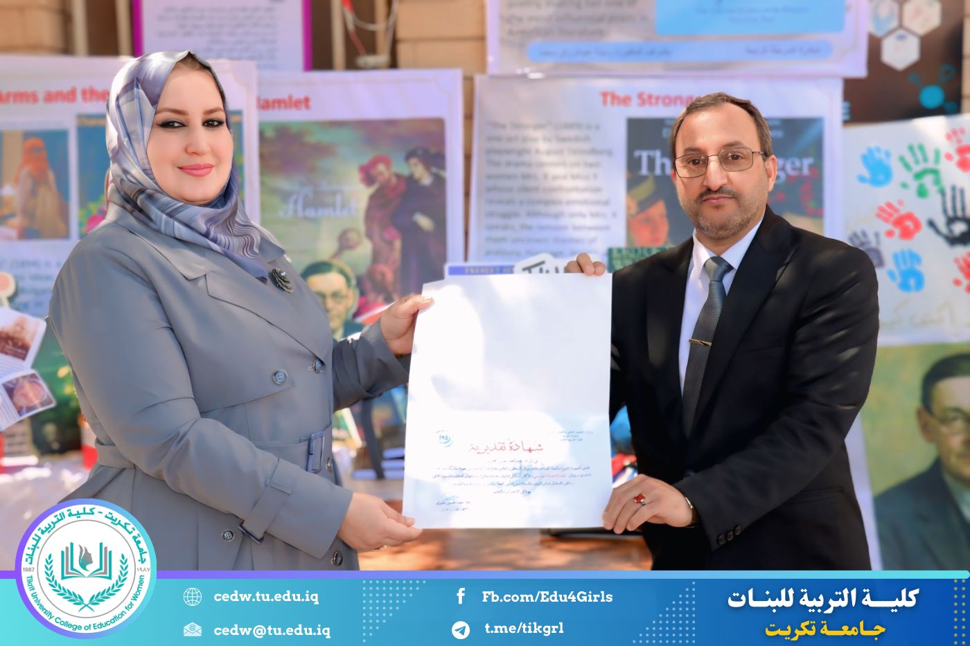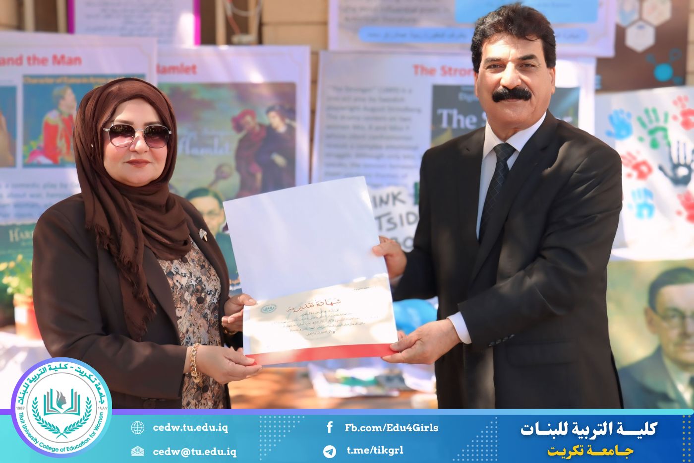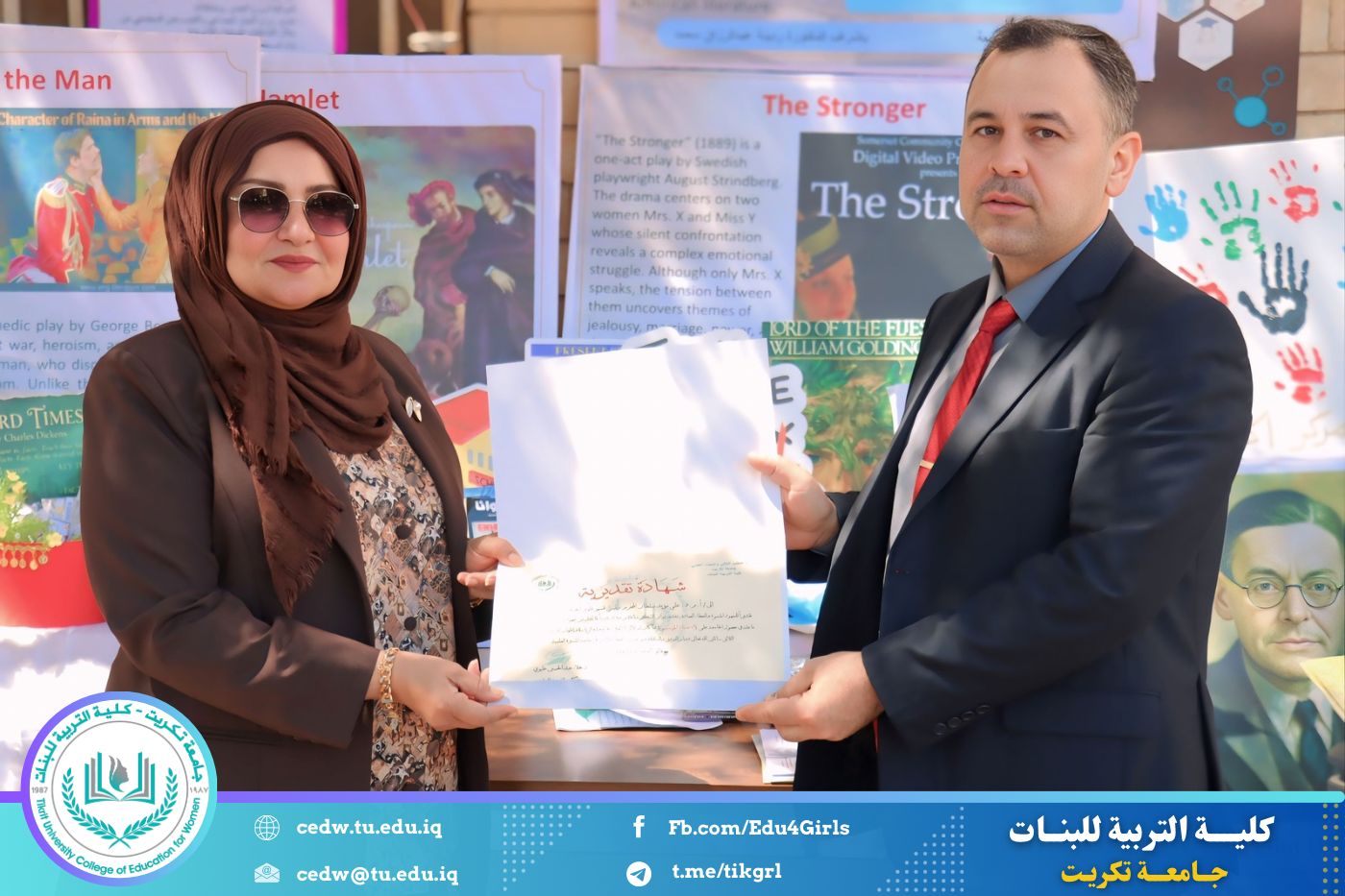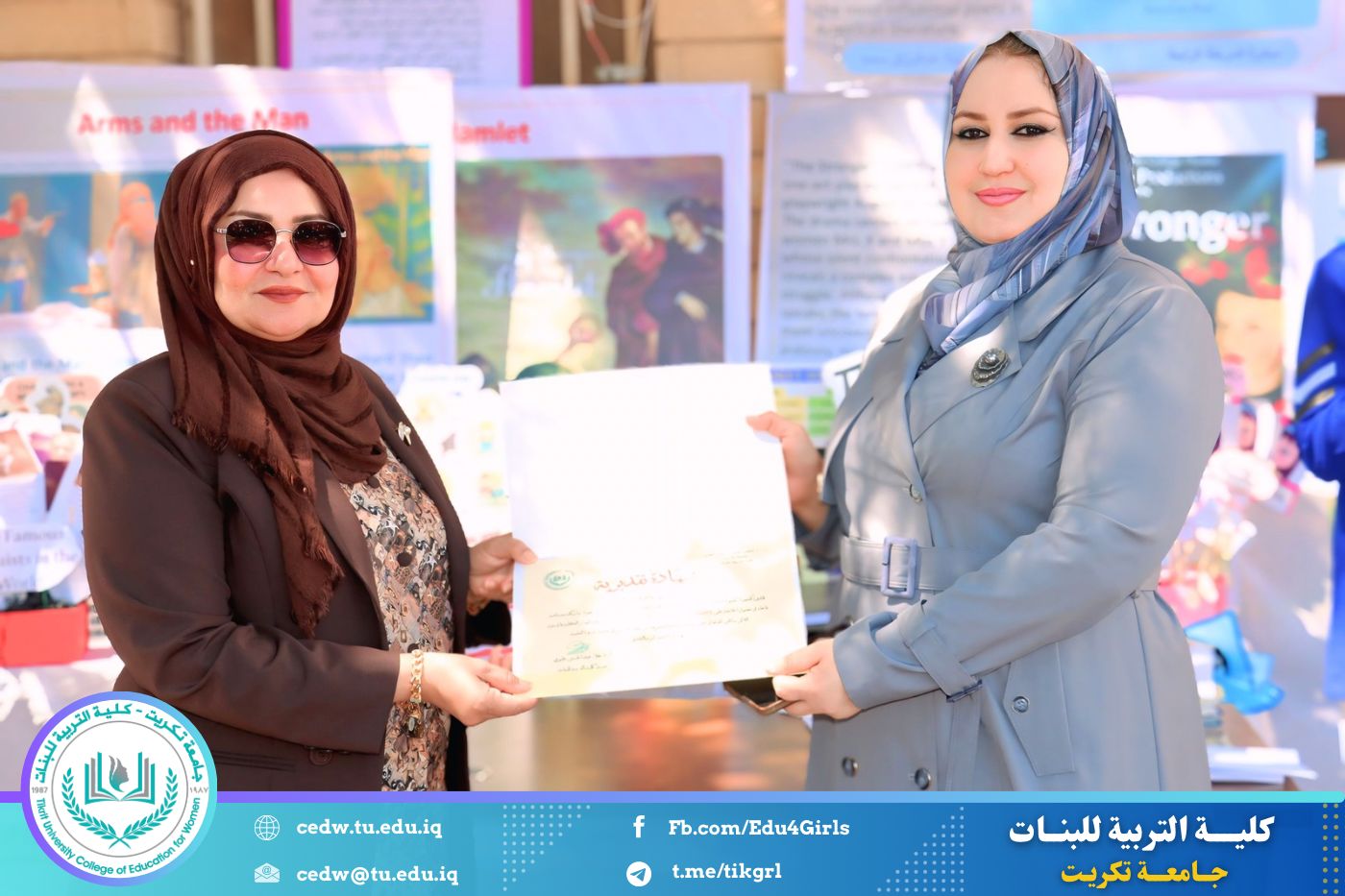 ضمن أجواء احتفالية متميزة، أقامت كلية التربية للبنات في جامعة تكريت فقرة تكريمية شاملة، كرّمت فيها نخبة من اللجان المركزية والفرعية والمساندة للاعتماد البرامجي، إلى جانب رؤساء الأقسام العلمية، ومسؤولي الشعب والوحدات، وأصحاب الألقاب العلمية الحاصلين على الترقيات العلمية، فضلاً عن مسؤولي المختبرات، وذلك بمنحهم كتب شكر وتقدير وشهادات تقديرية، تثميناً لجهودهم وعطائهم المتواصل.