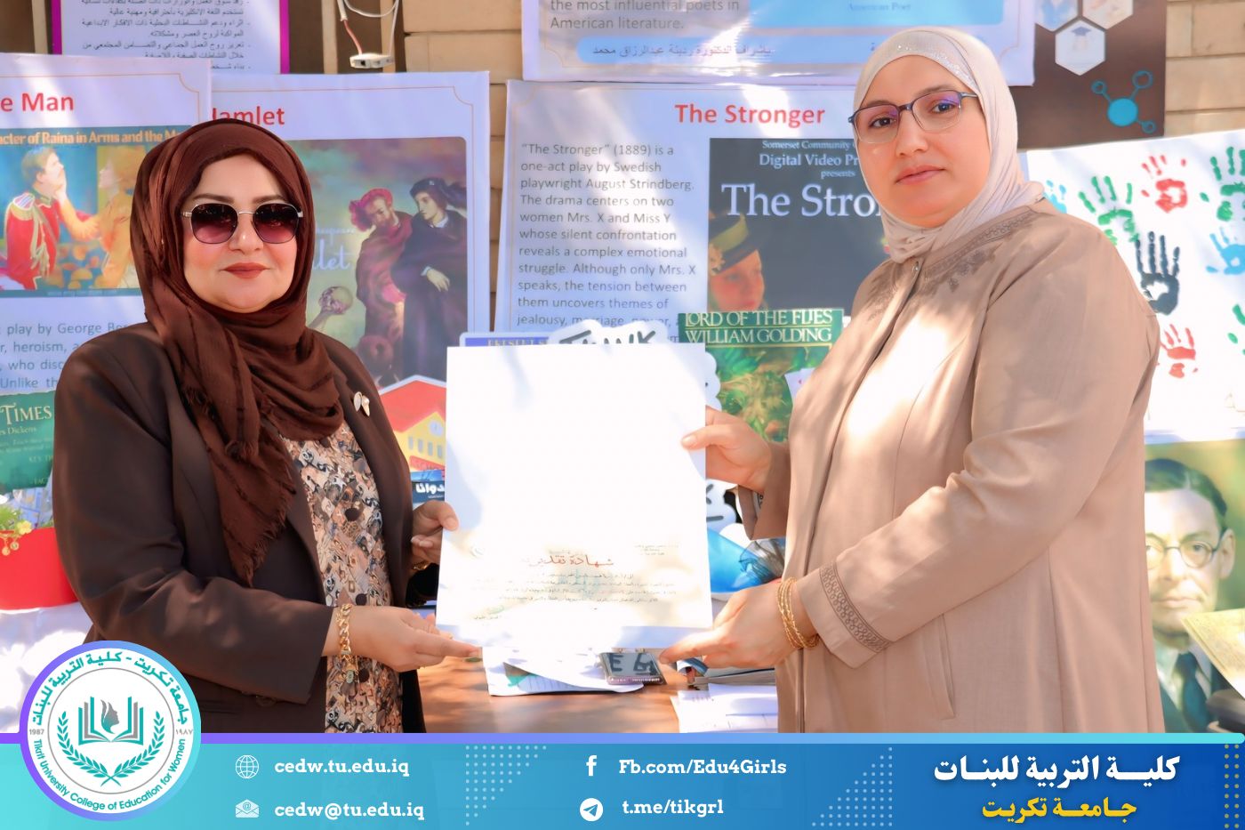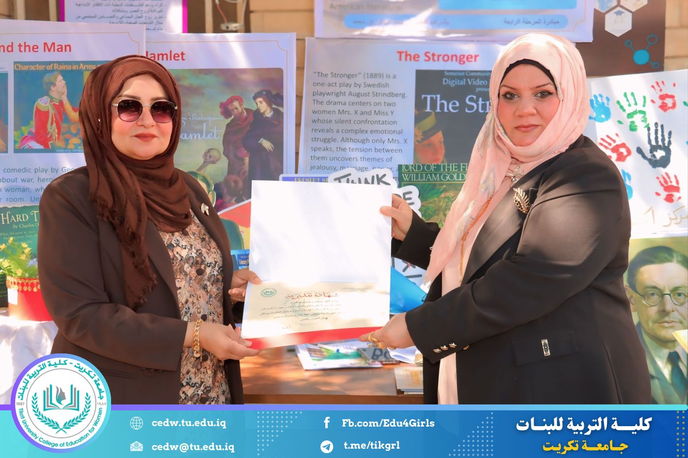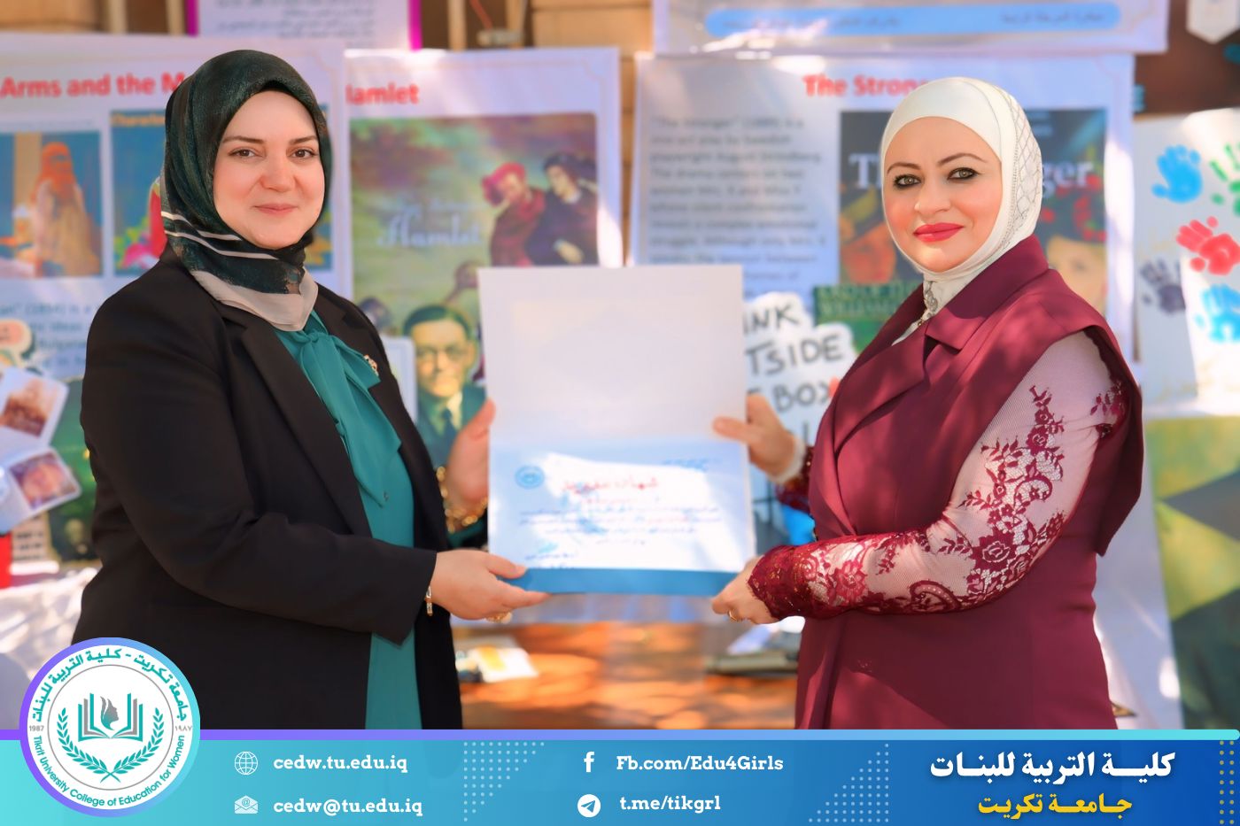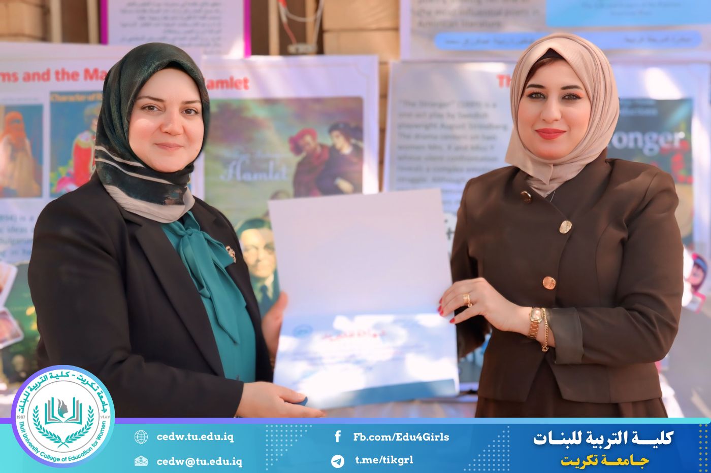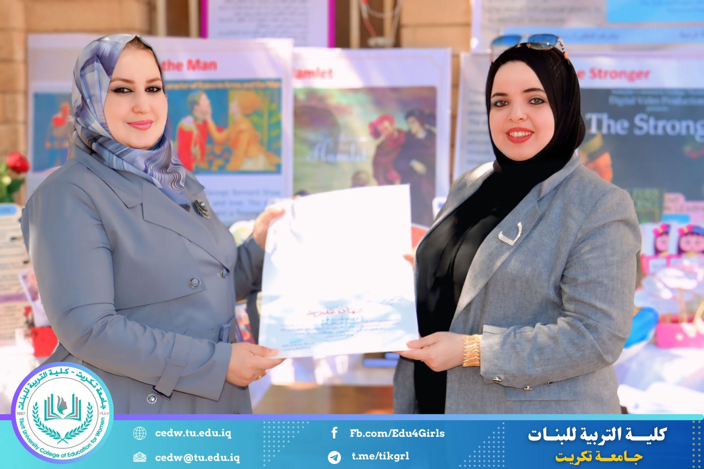 ضمن أجواء احتفالية متميزة، أقامت كلية التربية للبنات في جامعة تكريت فقرة تكريمية شاملة، كرّمت فيها نخبة من اللجان المركزية والفرعية والمساندة للاعتماد البرامجي، إلى جانب رؤساء الأقسام العلمية، ومسؤولي الشعب والوحدات، وأصحاب الألقاب العلمية الحاصلين على الترقيات العلمية، فضلاً عن مسؤولي المختبرات، وذلك بمنحهم كتب شكر وتقدير وشهادات تقديرية، تثميناً لجهودهم وعطائهم المتواصل.