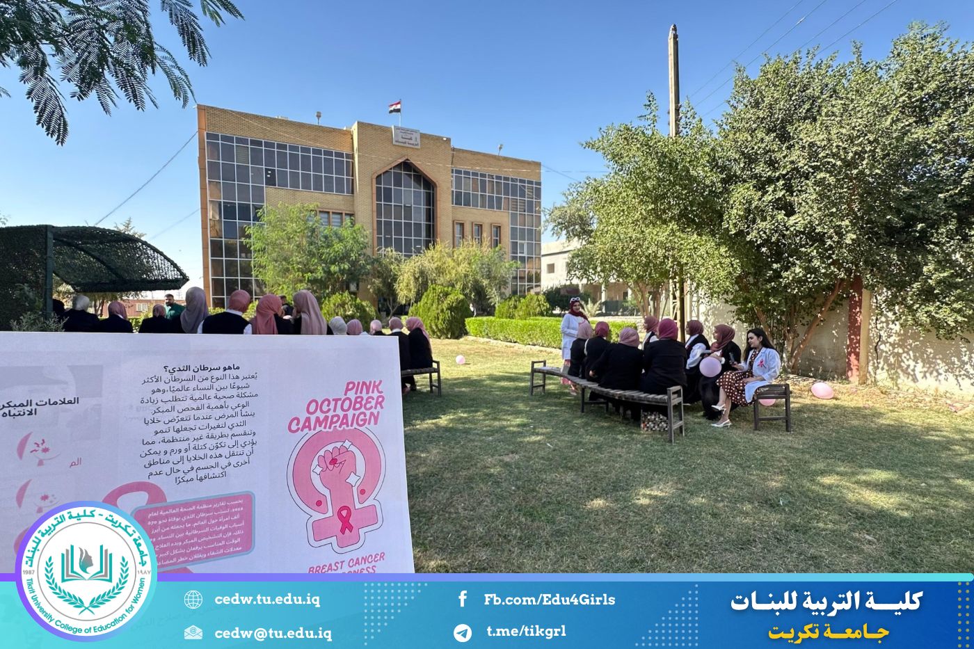 نظّمت وحدة الإرشاد النفسي والتوجيه التربوي بالتعاون مع قسم اللغة الإنكليزية وفريقٍ طبي تطوعي من طلبة كلية الطب، حملةً توعوية بعنوان "من قلب التحدي.. يولد الأمل الوردي"، وذلك يوم الثلاثاء الموافق ٢٨ تشرين الأول ٢٠٢٥، في حدائق كلية التربية للبنات – جامعة تكريت.