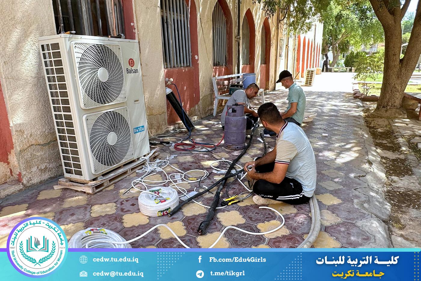 وقد تولّى فريق الصيانة الخاص بالكلية تنفيذ هذه الأعمال، والتي تضمنت صيانة أجهزة السبالت والمكيفات الهوائية لضمان استمرار عملها بكفاءة عالية، إضافة إلى صيانة القاعات الدراسية ومعالجة المقاعد الخاصة بالطالبات في جميع الأقسام العلمية والإنسانية. كما شملت الحملة تنظيفاً واسعاً للقاعات الدراسية وأروقة الكلية وساحاتها الداخلية والخارجية، بما يعكس حرص الإدارة على توفير بيئة نظيفة وصحية.