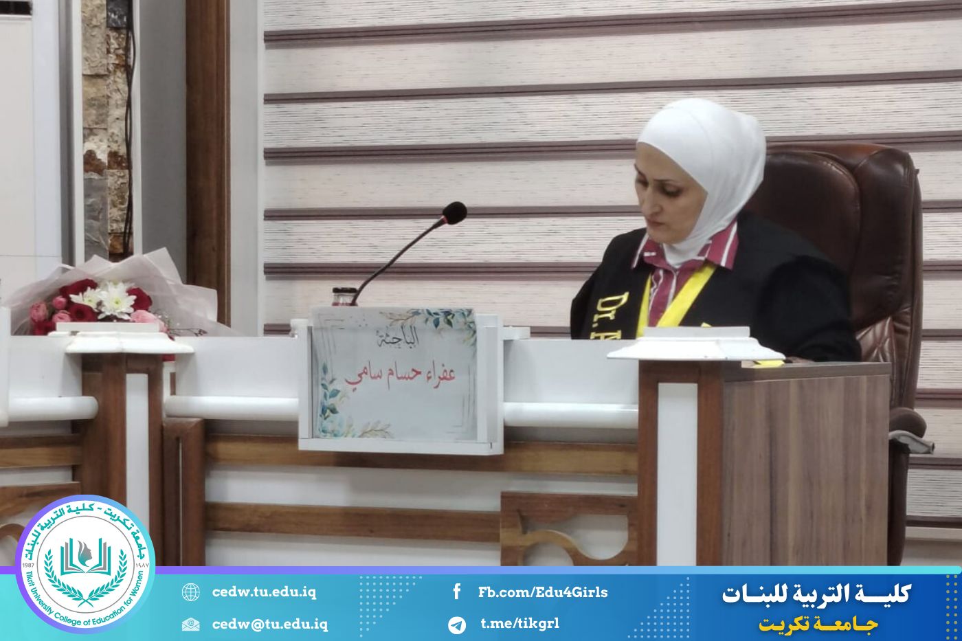 تتقدّم عمادة كلية التربية للبنات بجامعة تكريت، متمثلةً بالسيدة عميد الكلية الأستاذ الدكتورة نجلاء عبدالحسين عليوي، وكادرها التدريسي والإداري، بأجمل التهاني وأصدق التبريكات إلى الأستاذ المساعد الدكتورة عفراء حسام سامي من قسم اللغة الإنكليزية، بمناسبة حصولها على شهادة الدكتوراه بتقدير (جيد جداً عالٍ) عن أطروحتها الموسومة: