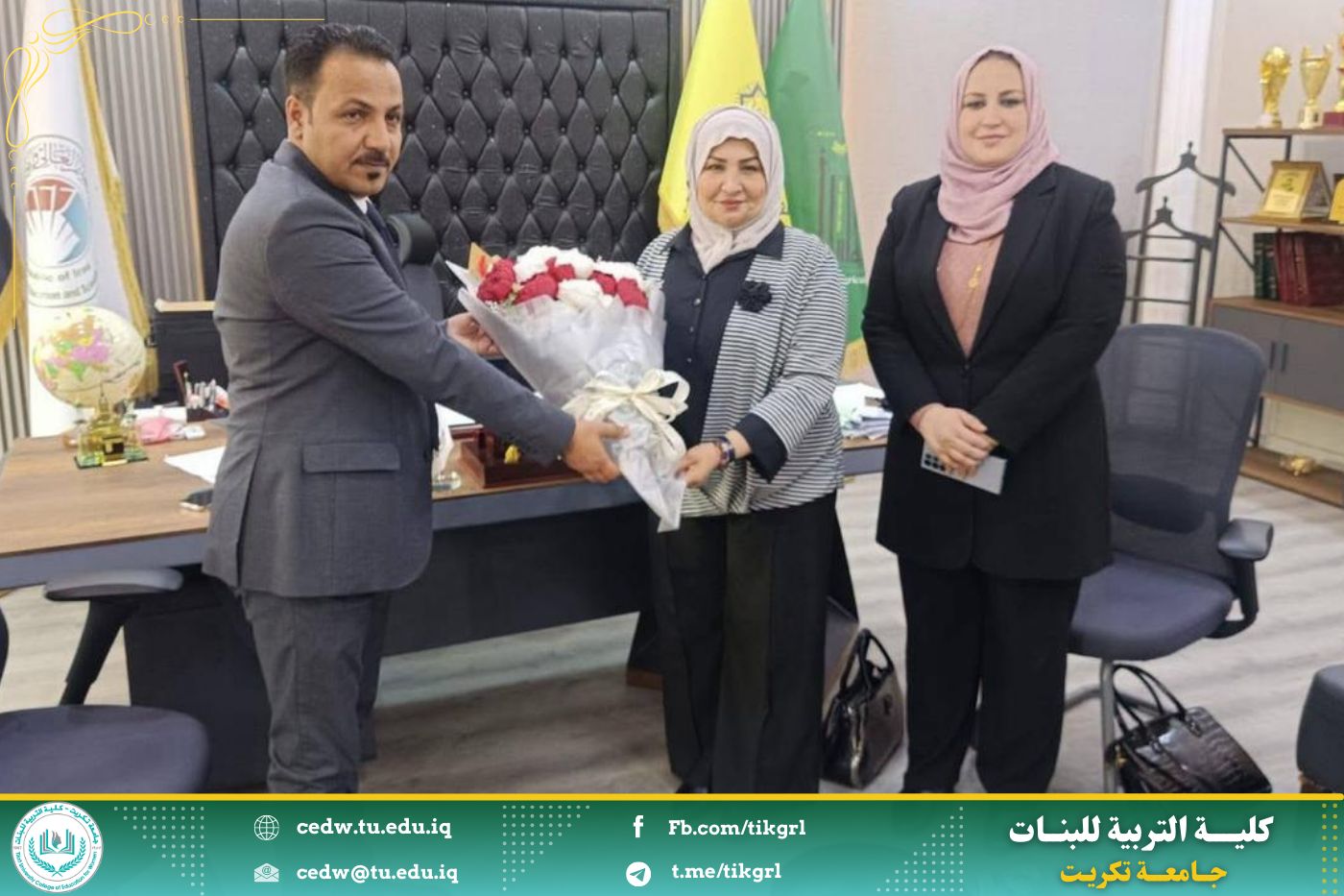 وكان في استقبالها الأستاذ المساعد الدكتور (سامي خضر سعيد)، إذ قدمت سيادتها التهنئة له سائلة المولى عزوجل أن يوفقه ويسدد خطاه ويديم فيض عطائه..