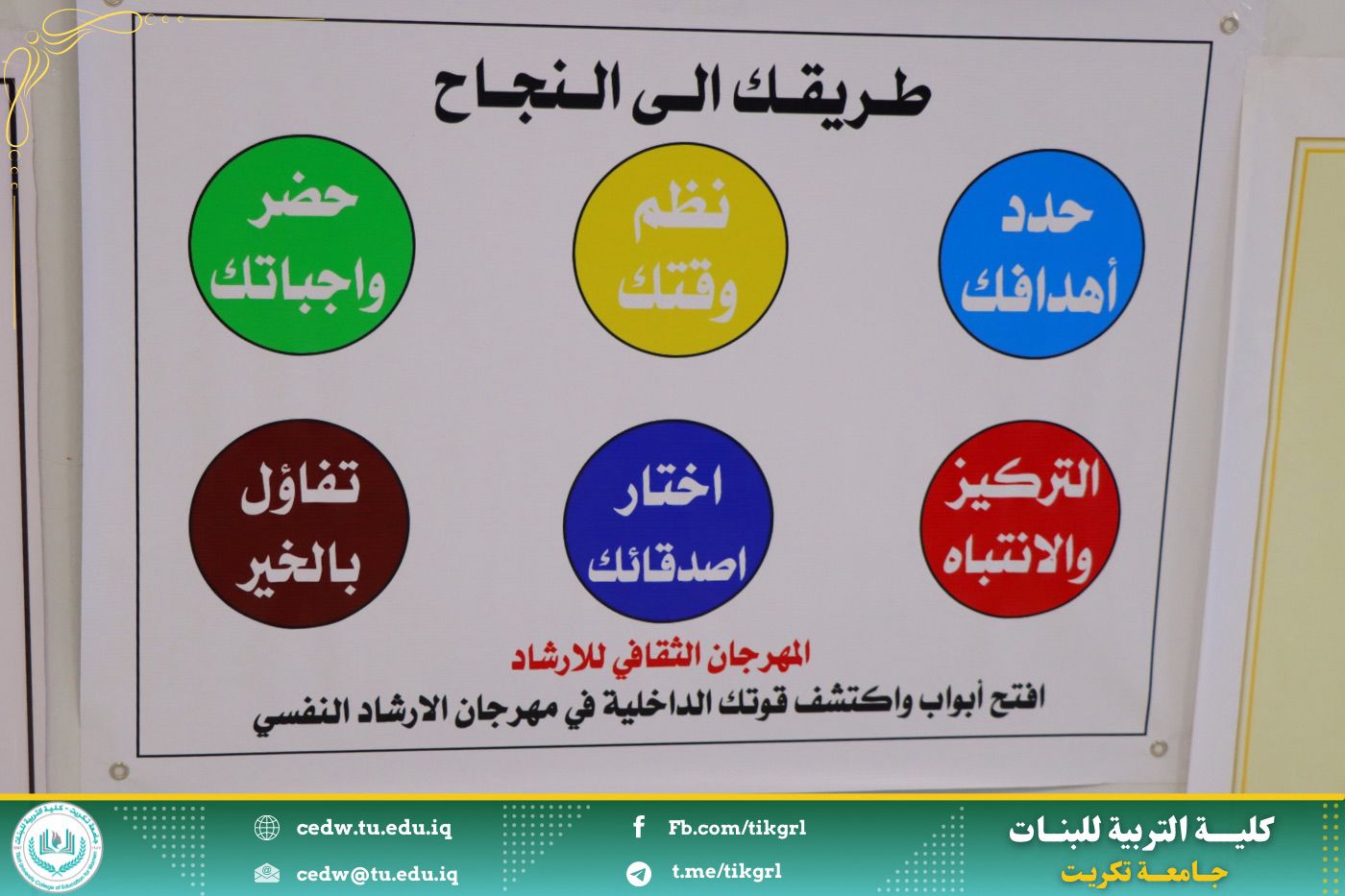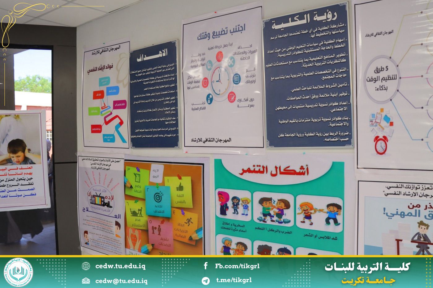 وتناول المهرجان كتابة عدة مقالات إرشادية هادفة لتدريسيي قسم العلوم التربوية والنفسية أ.د. بشرى خطاب عمر، أ.د. زبيدة عباس محمد ، أ.د. لطيف غازي مكي، أ.م.د. غزوان رمضان صالح، م.د. محمد العبد ربه، تم توزيعها على السادة الحضور ، وكذلك ندوة علمية بعنوان ( تعزيز الإرشاد والصحة النفسية في مواجهة الآفات الاجتماعية ) شارك في إلقائها أ.د. نبيل عبدالعزيز عبد الكريم، أ.د. زكريا عبد احمد، م.د. صفاء خيرالله ابراهيم