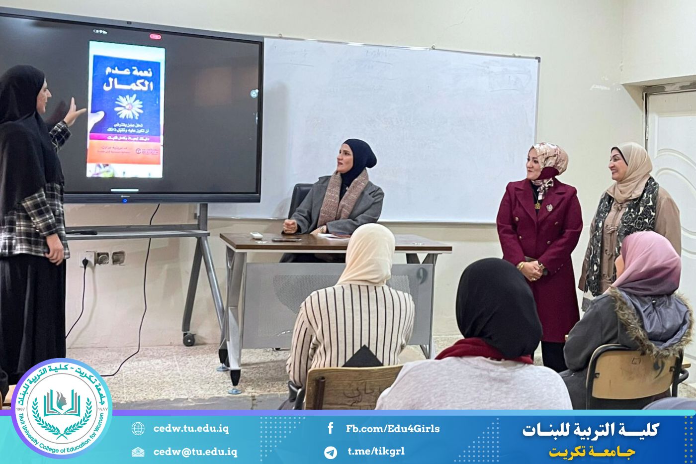 وقد قدّم الجلسة كلٌّ من الأستاذ الدكتورة أنسام رياض عبد الله، والمدرس المساعد بسمة فيصل علي، بمشاركة الطالبتين حنين قاسم دحام وسرى سعدي حسين، حيث تناولت الجلسة محاور الكتاب وأفكاره الرئيسة، مع فتح باب النقاش والتفاعل بين الطالبات.