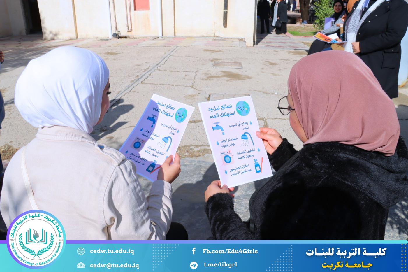 ضمن إطار دورها التوعوي والمجتمعي في نشر الثقافة البيئية وتعزيز مفاهيم الاستدامة، نظّمت كلية التربية للبنات حملة توعوية بعنوان (تقليل استهلاك المياه وطرق استخدامها بصورة صحيحة)، بهدف رفع مستوى الوعي بأهمية الحفاظ على الموارد المائية وترشيد استهلاكها.