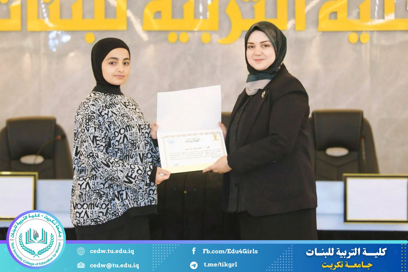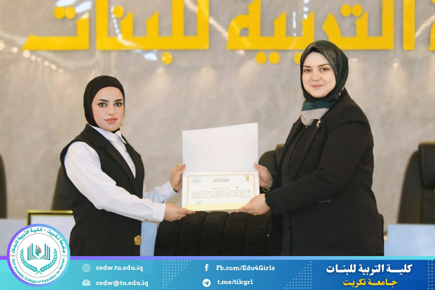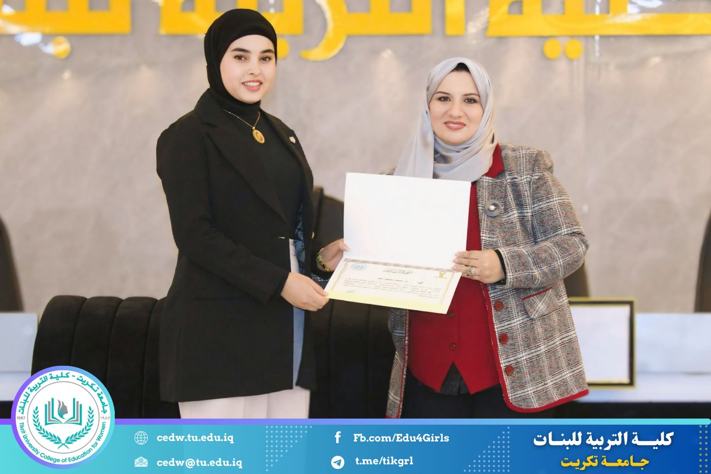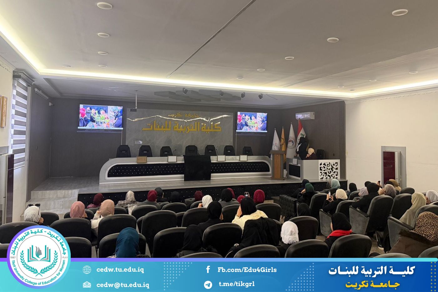 انسجامًا مع توجهات كلية التربية للبنات في جامعة تكريت الهادفة إلى دعم الابتكار وترسيخ ثقافة الريادة في الوسط الجامعي، نظّمت وحدتا شؤون المرأة والتأهيل والتوظيف والمتابعة وبالتعاون مع الأقسام الإنسانية في الكلية، مهرجانًا احتفاليًا صباح اليوم الاثنين الموافق ٨ كانون الأول ٢٠٢٥، على رحاب قاعة المرحوم جايد زيدان، لتكريم الطالبات المشاركات والفائزات في مسابقة الأسبوع الريادي، والذي جاء تحت شعار: